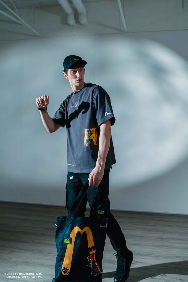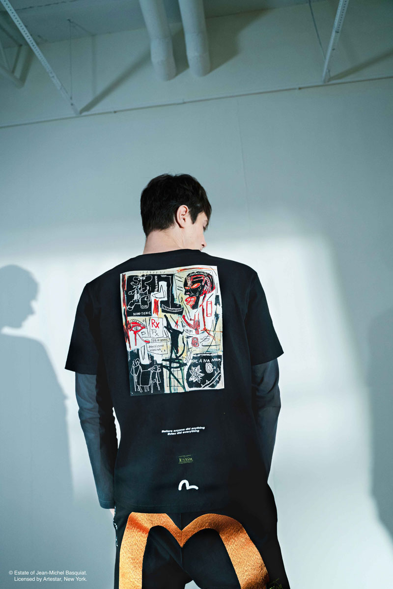 本次联名 EVISU 选择了 Basquiat 标志性图案和涂鸦元素配以 EVISU 的经典标志及图案,致力于打造独一无二的街头穿着的艺术品。