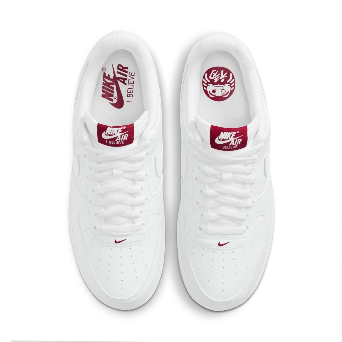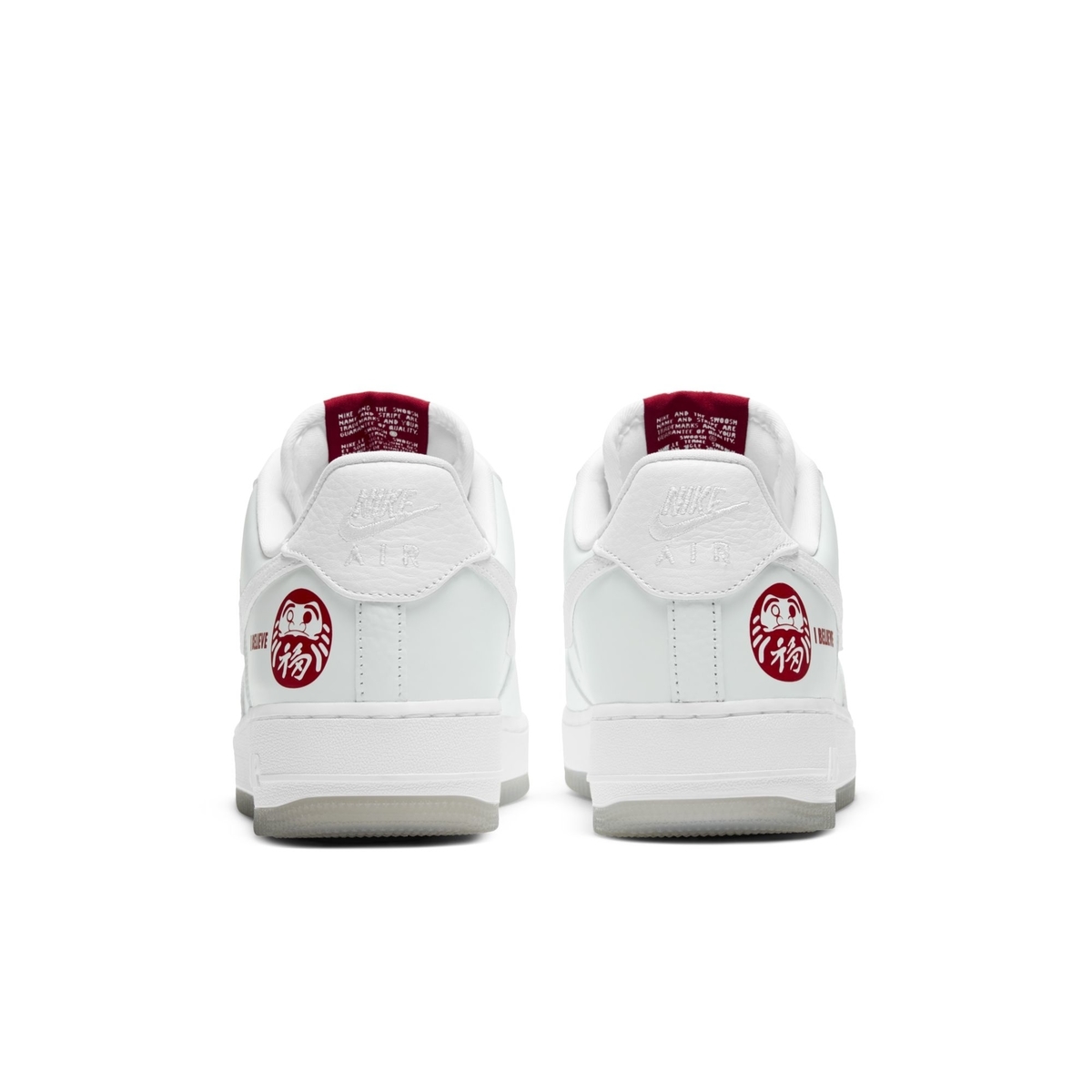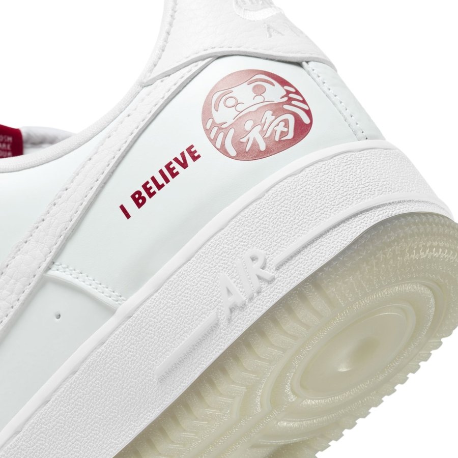 外层以纯白为主色调,后跟点缀红色 I BELIEVE 字样和达摩图案。