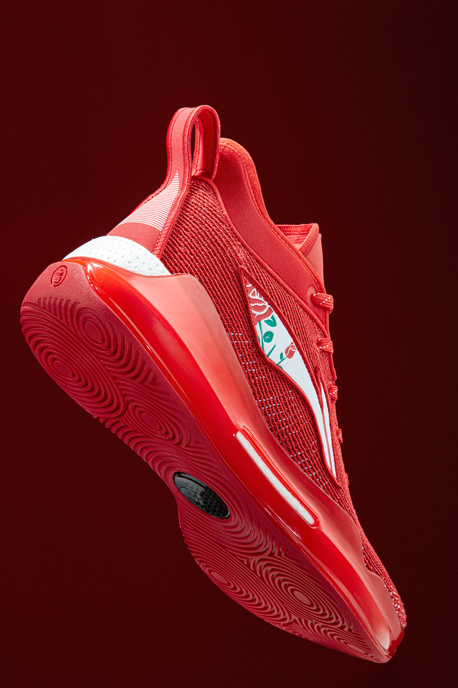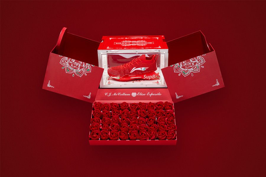 依然延续了大红主调,在李宁 Logo 上点缀玫瑰图案。