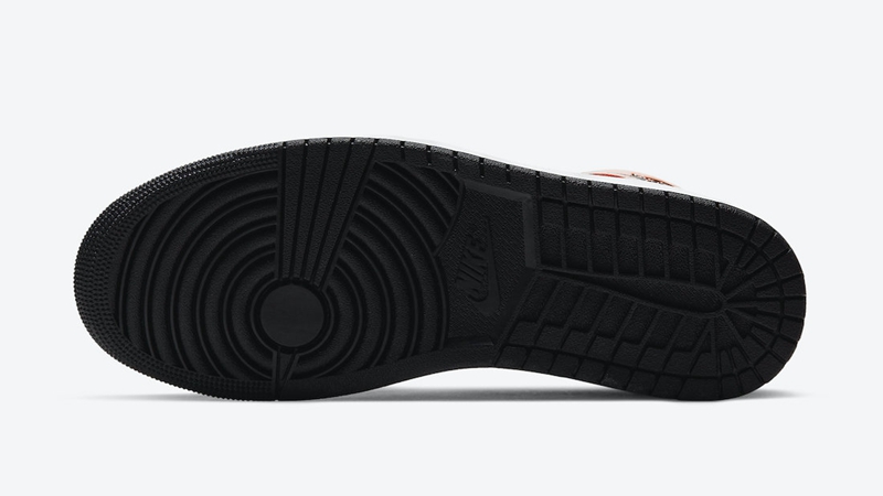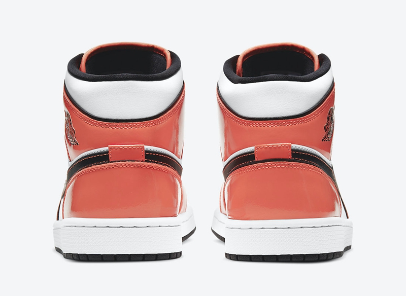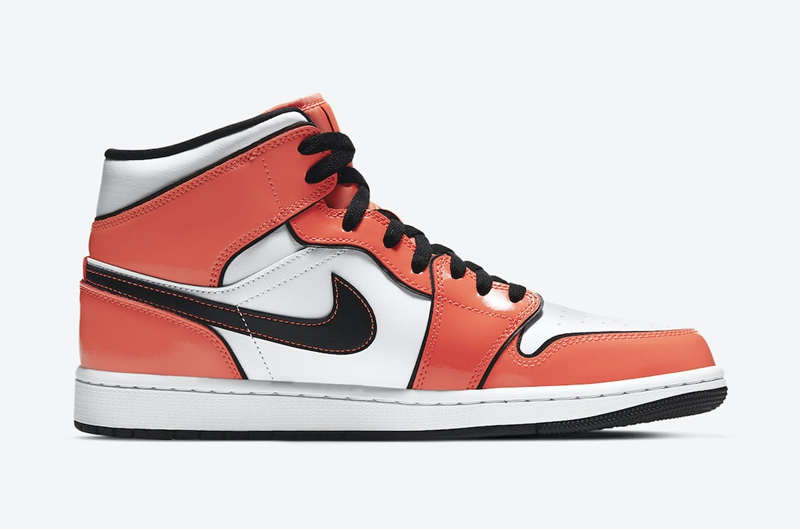 整体延续 Air Jordan 1 Mid 经典的 8 孔鞋身,以白色为主调,搭配亮橙色的漆皮框架,视觉效果十分吸睛。