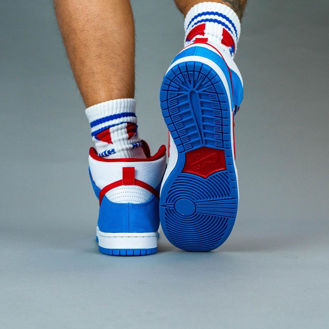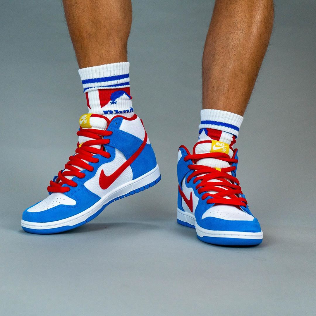 鞋舌处缀有黄色 Nike SB 标签,恰好对应哆啦 A 梦脖子处的铃铛颜色。