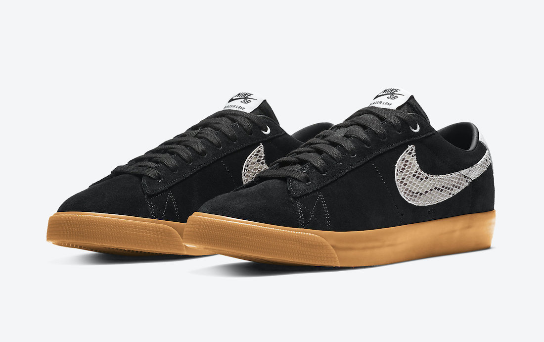 另一款则以低帮 Blazer Low 为蓝本,一袭酷黑笼罩,搭配生胶色中底,街头气息十足。