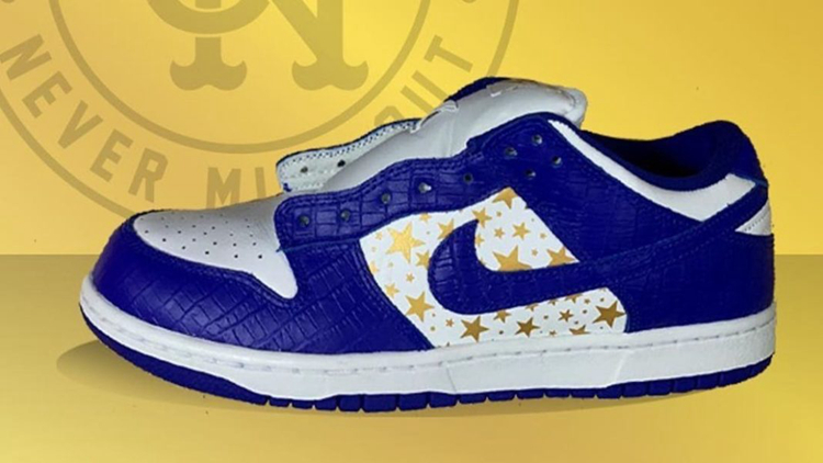 鞋身侧面采用金色星星图案点缀,设计手法与 2003 年发售的 Supreme x Dunk Hi 如出一辙。