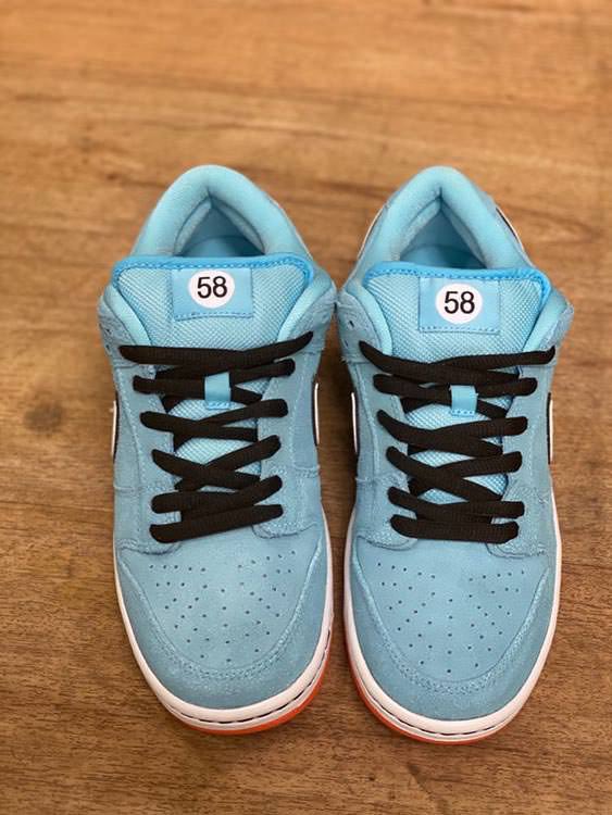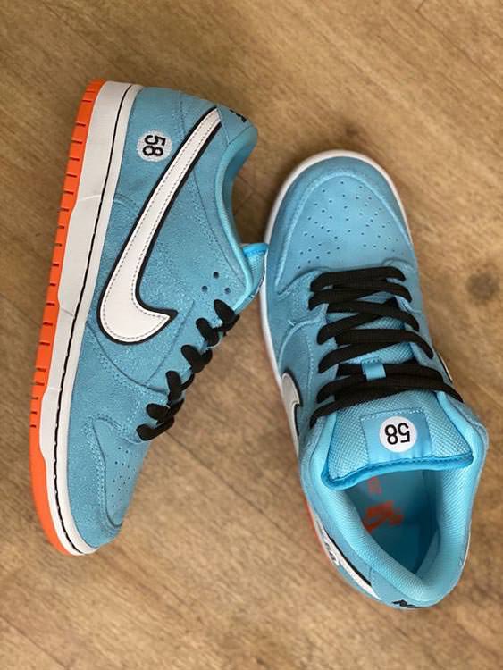 赛车上的圆形编号在后跟外侧及鞋舌呈现,以 58 字样代表着 SB 的缩写。