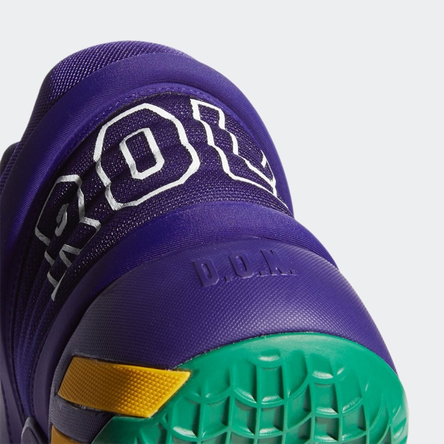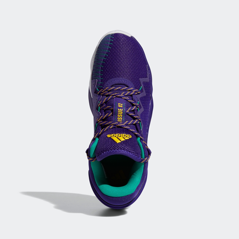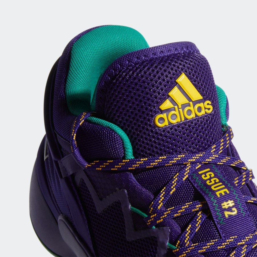 鞋舌处的黄色的 adidas Logo 以及 ISSUE #2 字样与鞋面呼应,呈现犹他爵士队血统。