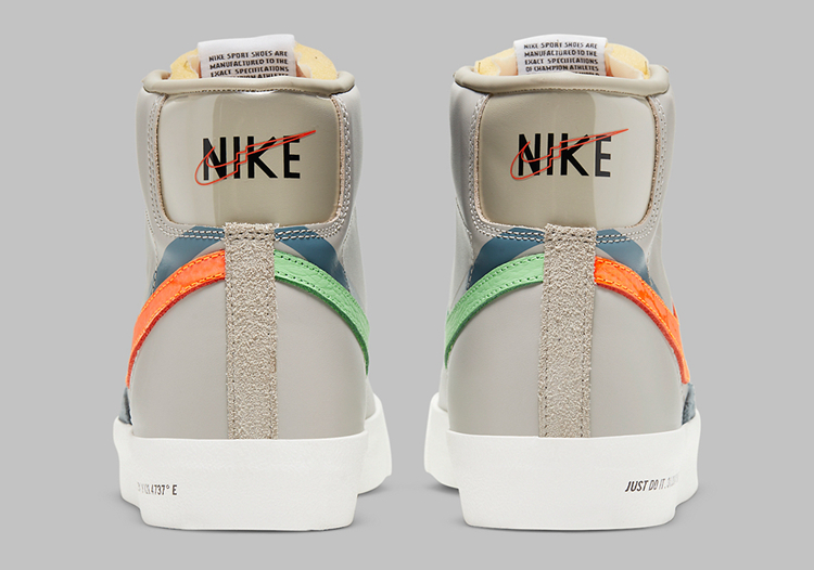 鞋身两侧 Swoosh Logo 采用「阴阳 + 双层」设计,由外侧橙色内侧青色呈现,并覆盖在蓝色 Swoosh 上,给整双鞋带来一丝亮眼表现的同时又颇具解构风格。