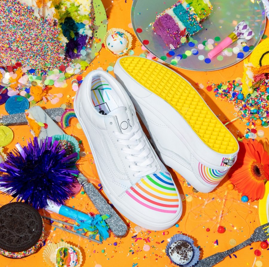 Old Skool 鞋款采用通体白色皮革打造鞋身,鞋头与后跟处缀以彩虹条纹印花,十分可爱。