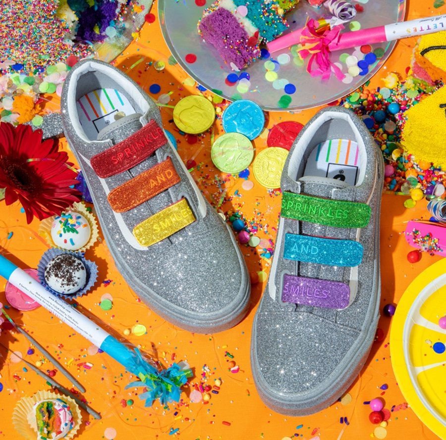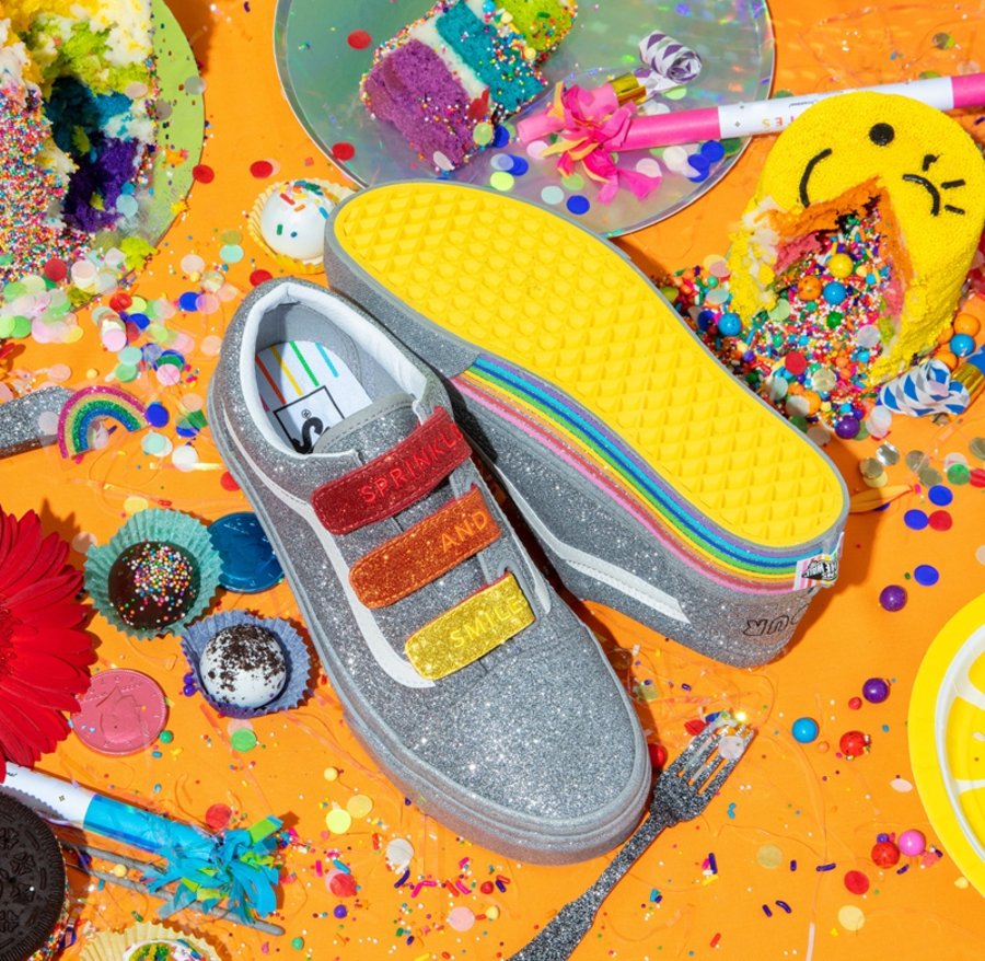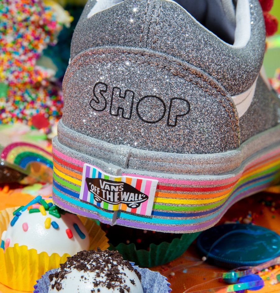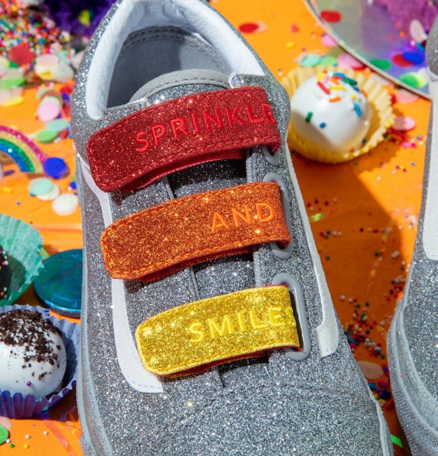 Old Skool V 以银色亮片包裹,彩虹条纹点缀外底包边处,并将鞋带替换成五彩的魔术贴,完善设计。