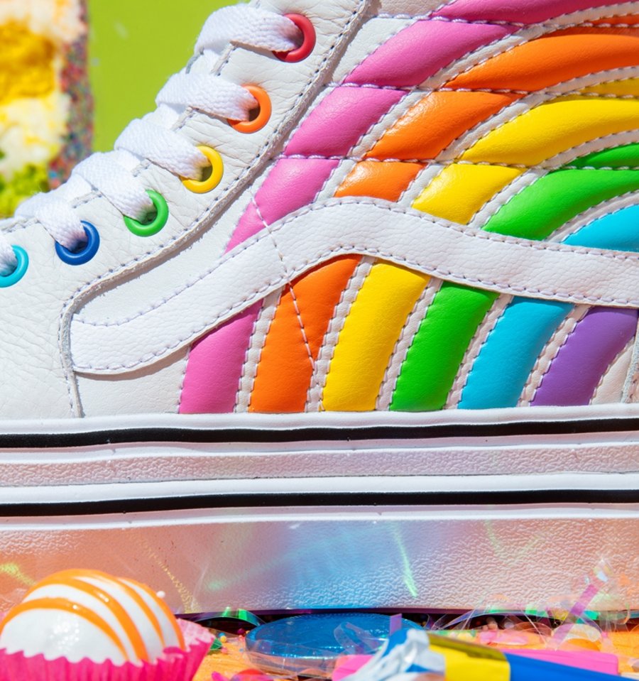 最后一双以经典的 Sk8-Hi 以白色为主体,彩虹元素遍布鞋帮,中底部分搭载双层 ComfyCush 大底,更好的保证了脚感。