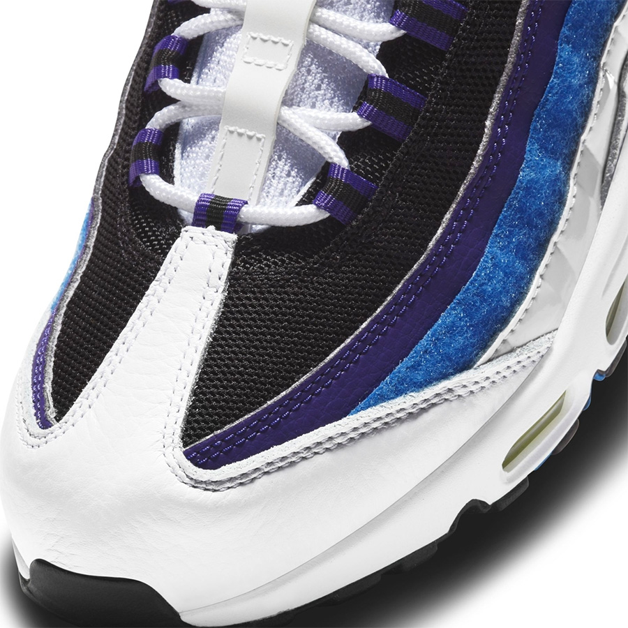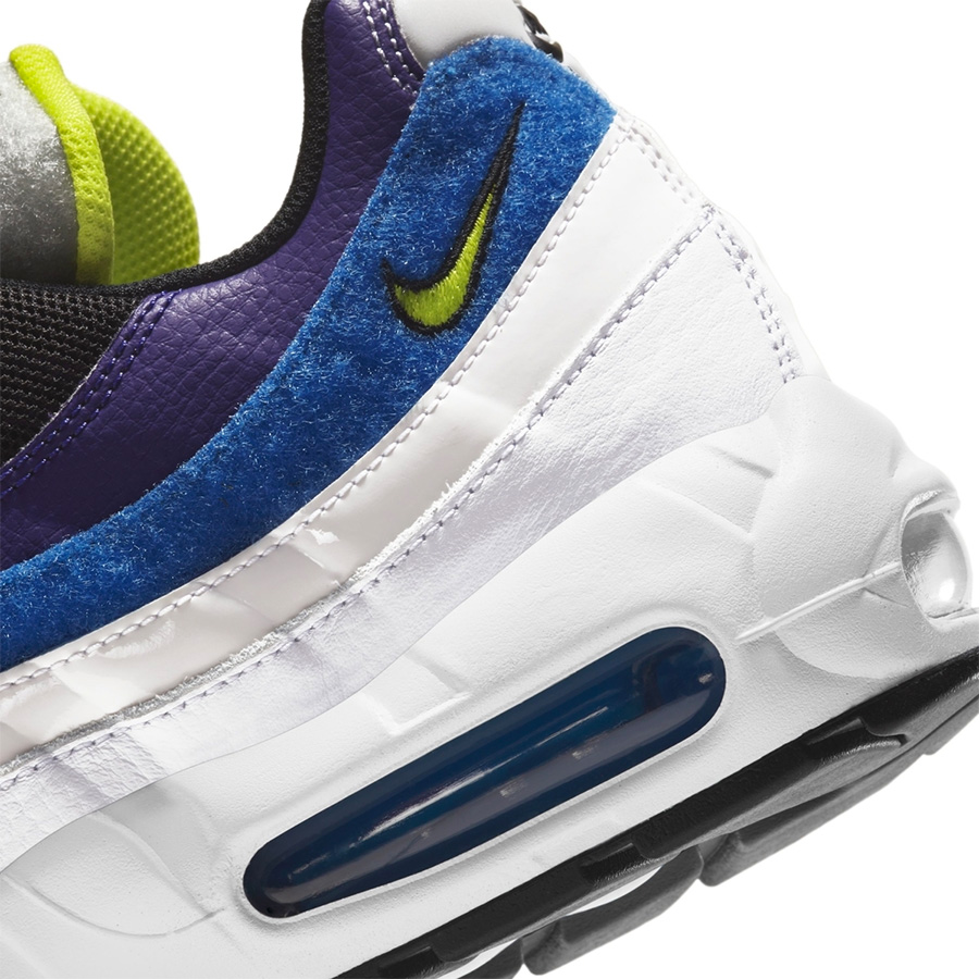 依然是视觉层次丰富的 Air Max 95 经典线条设计,其中鞋舌和鞋面的部分材质采用了魔术贴粘毛设计,可以在上面放置随鞋附带的趣味魔术贴。