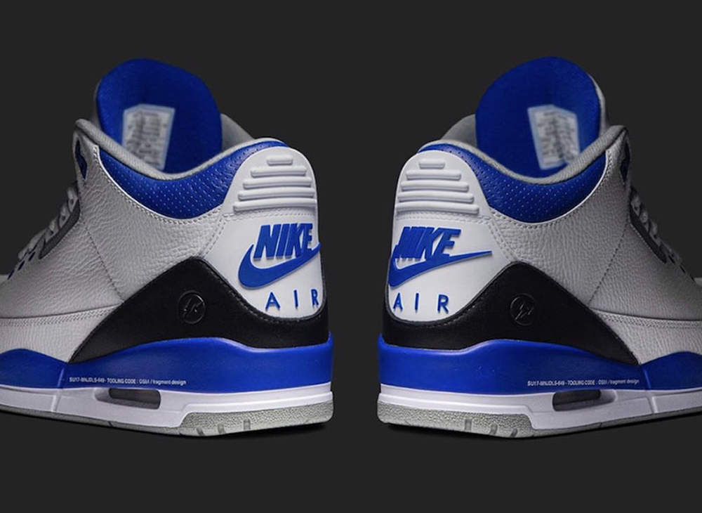 配色方案与大闪电 Air Jordan 3 如出一辙,但保留了传统爆裂纹,除此之外只有藤原浩个人元素的细节差别。