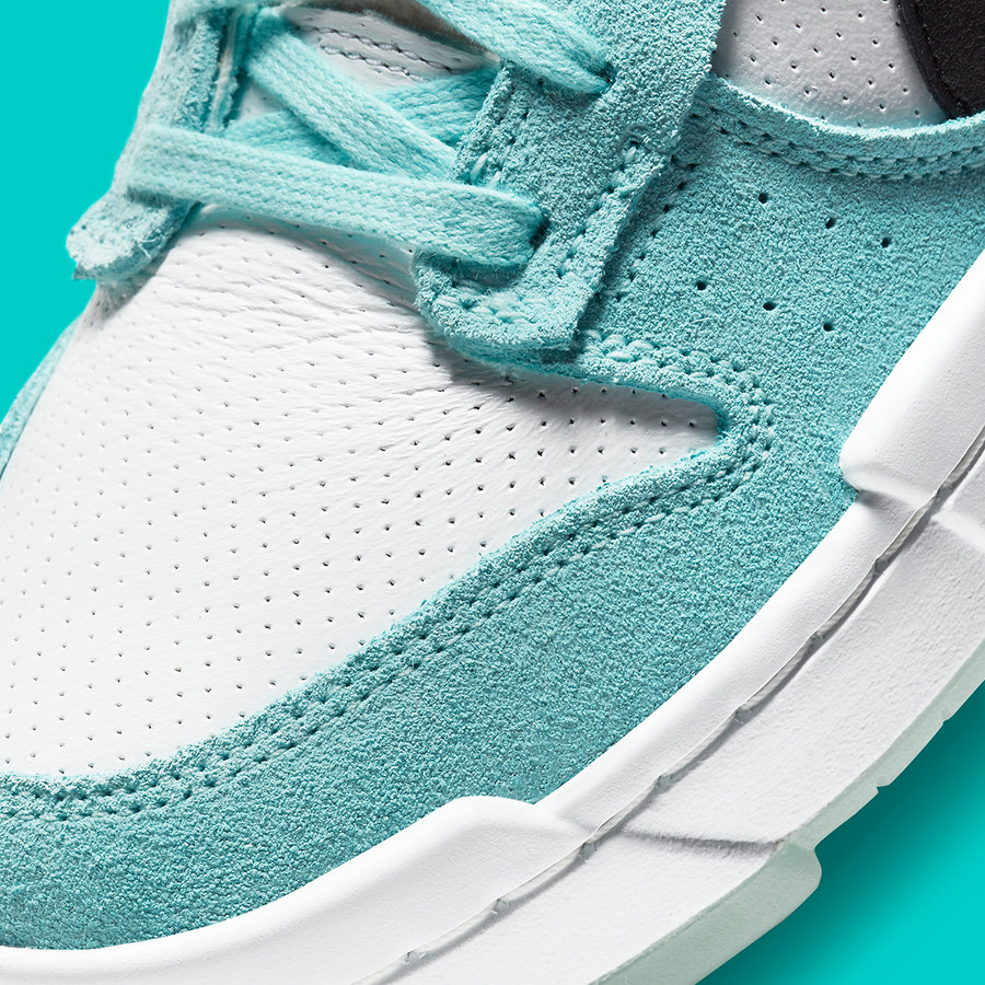 湖水绿色构成鞋身框架,辅以白色鞋面,侧身黑色 Swoosh Logo 点缀。
