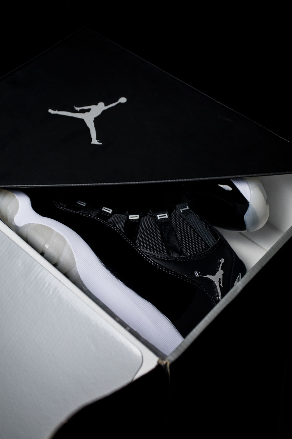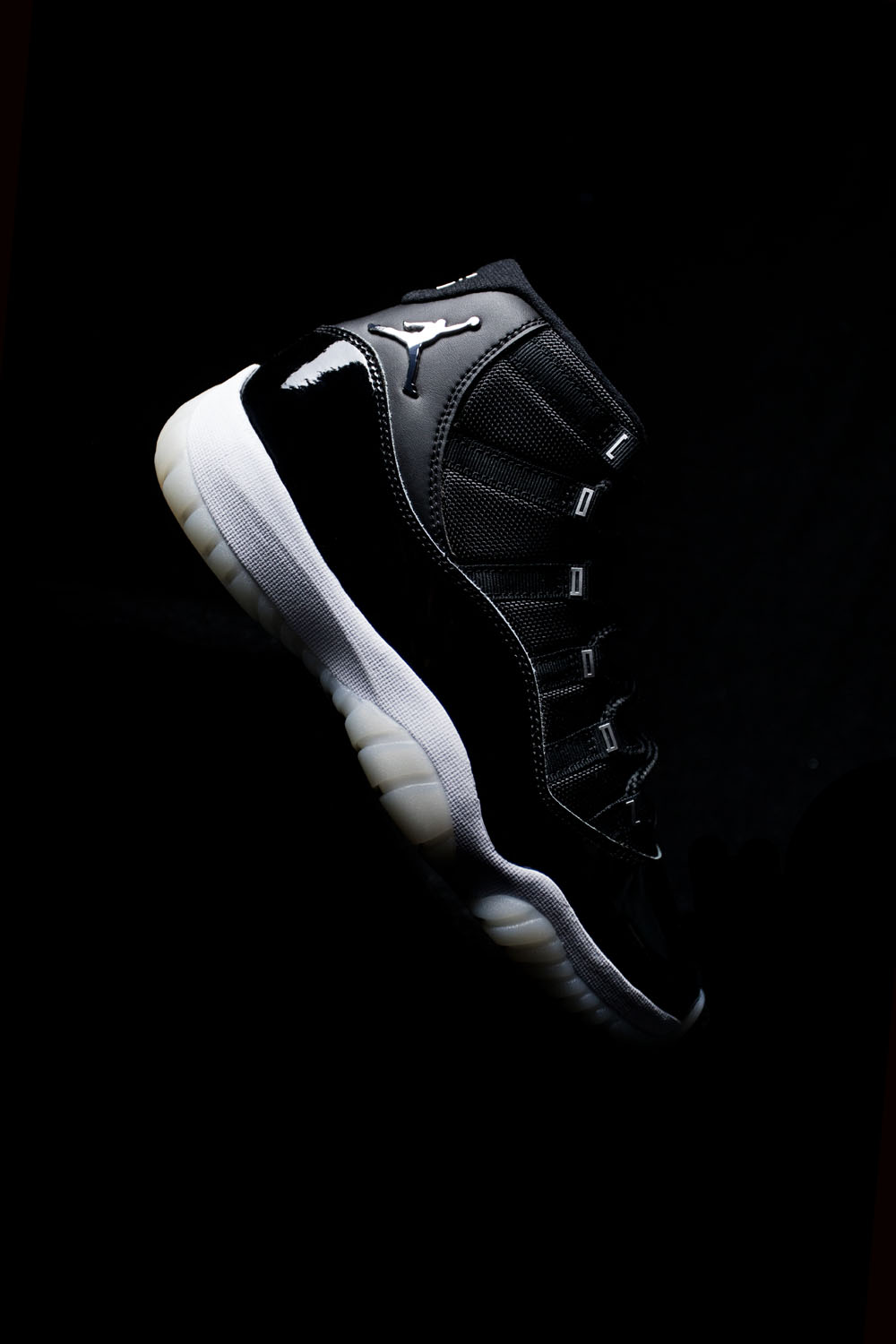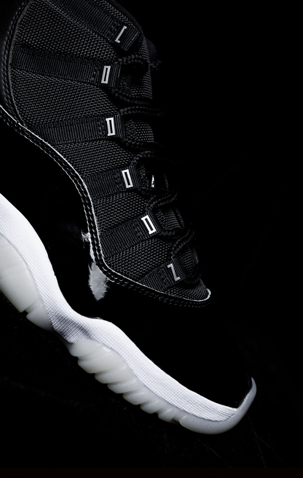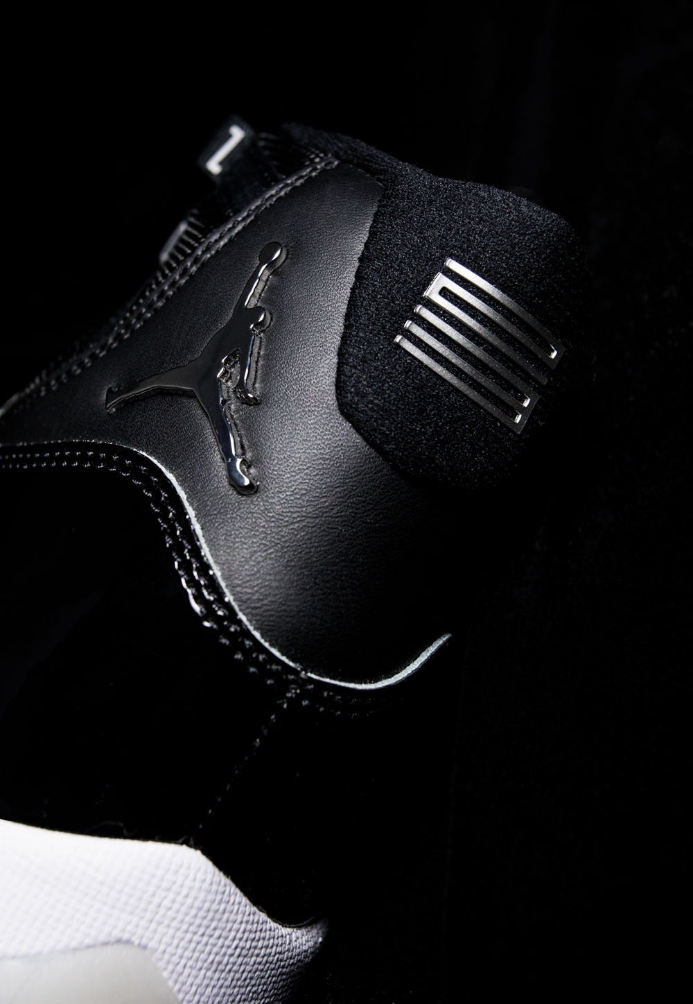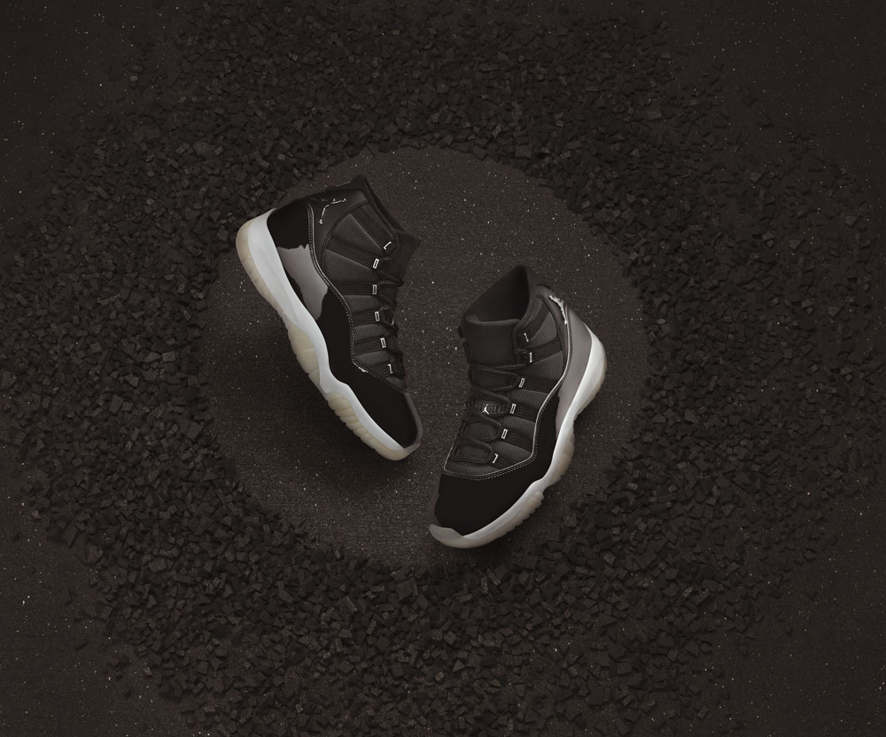 灵感来自 Air Jordan 11 最初的设计手稿,纯黑色鞋面上加入液态银点缀各处细节。
