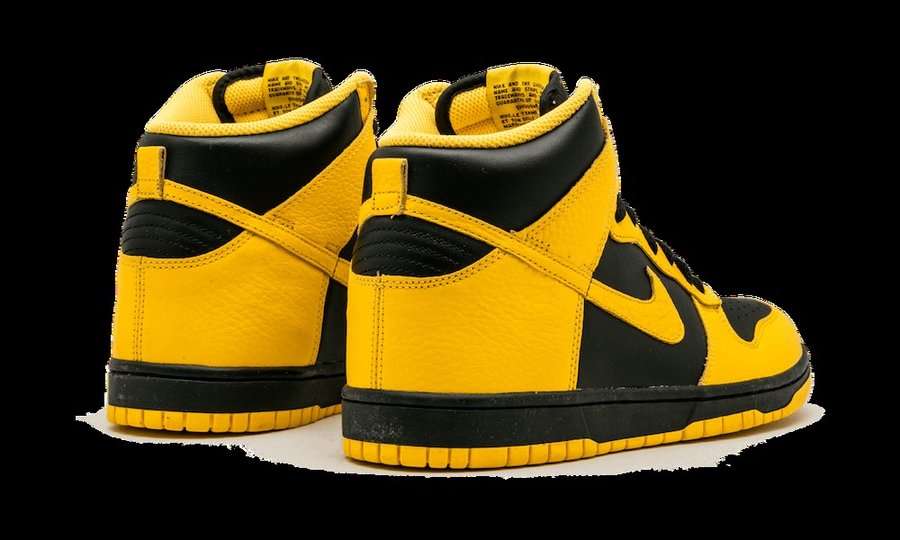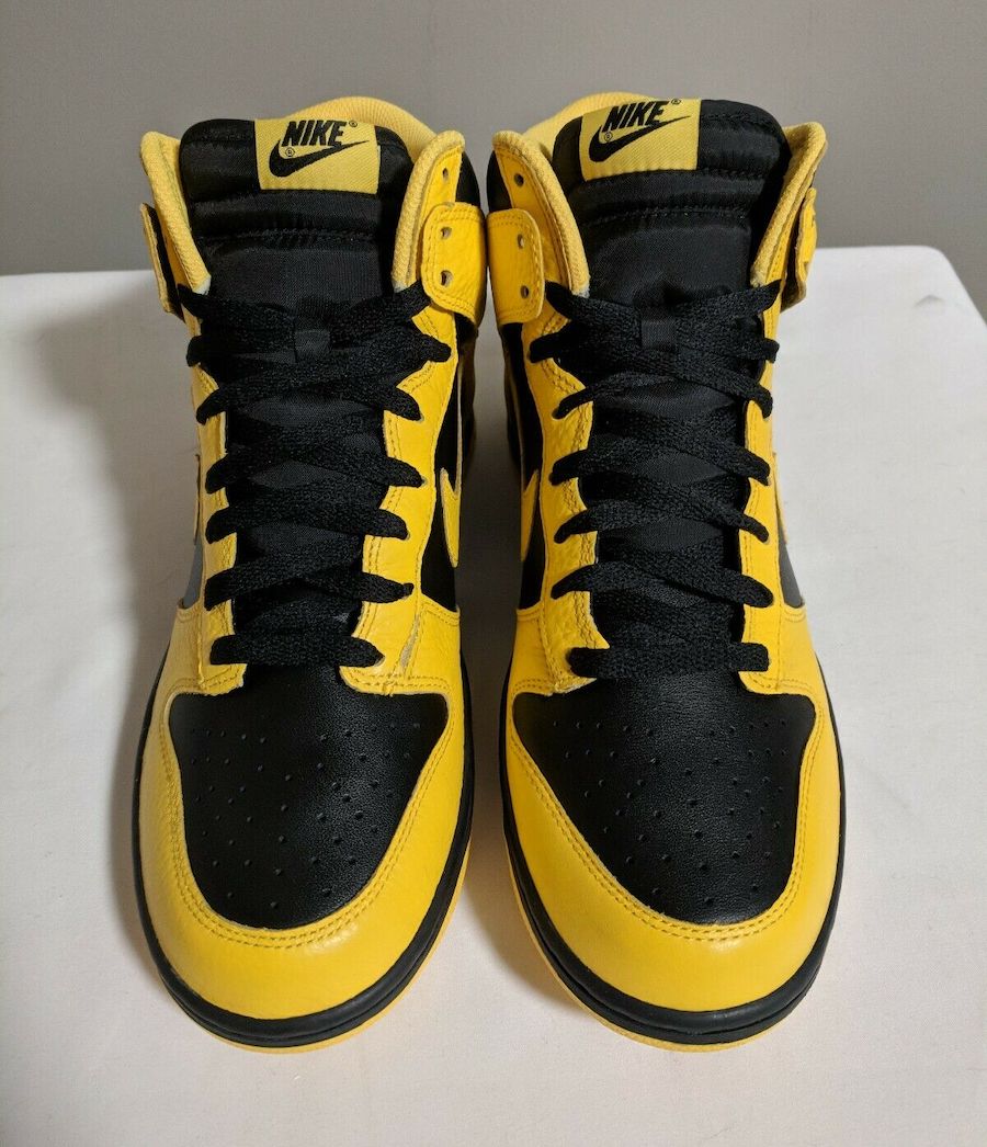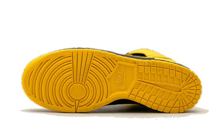 整体延续高帮 Dunk 的经典复古造型,黑、黄双色覆盖的鞋身格外醒目,颇有天价神鞋 “Wu-Tang” 的既视感。