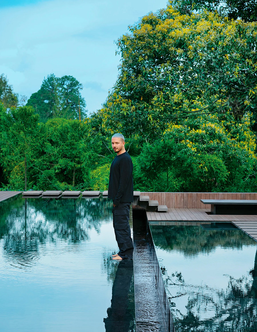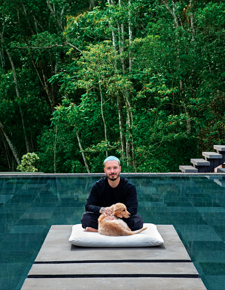 J Balvin 最爱的独家方式,就是与爱犬 Paz 坐在泳池边的 “冥想池” 中休憩。