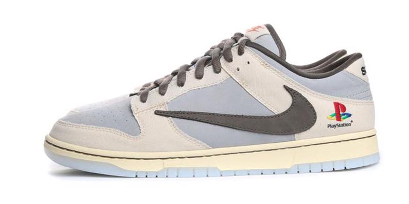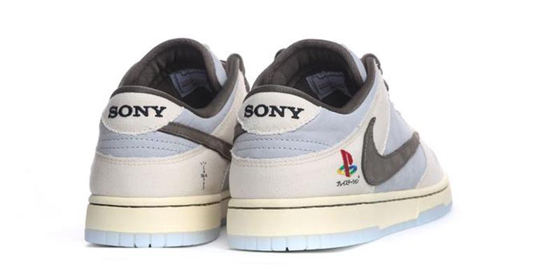 北京时间今天上午,Travis Scott 再度晒出与 Sony Playstation 和 Nike Dunk Low 三方联名的实物细节与上脚效果。