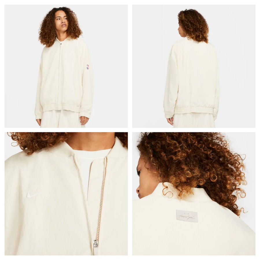长袖夹克的设计灵感源自复古 NBA 球队夹克,领口、袖口、下摆等位置均以复古样式呈现。