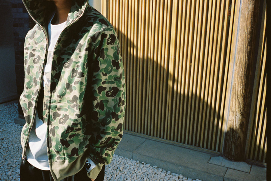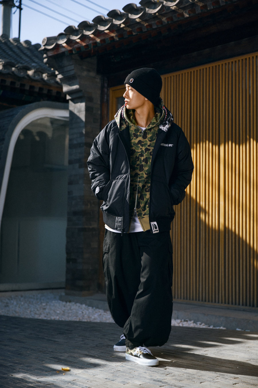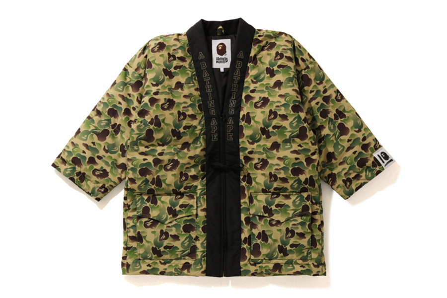 首次出现在周年系列的和风外套以日本传统袢缠(HANTEN)为原型复刻,衣身前后覆盖满版迷彩印花,门襟以刺绣手法呈现「A BATHING APE」字样。