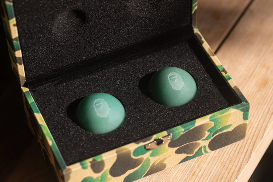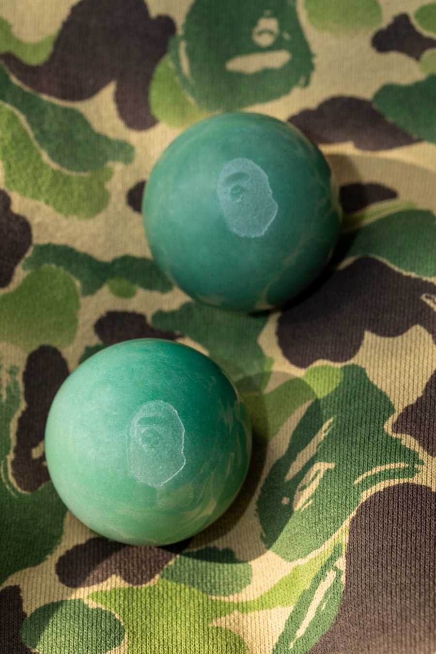 保定球又名健身球,本是古代文人案头手掌的把玩之物,BAPE® 以天然绿东陵石重塑其质地,经过手工打磨、抛光和过蜡等繁复工序,色泽温润光洁。