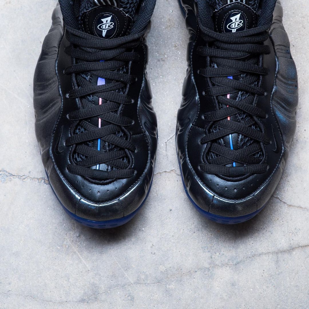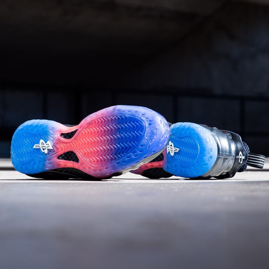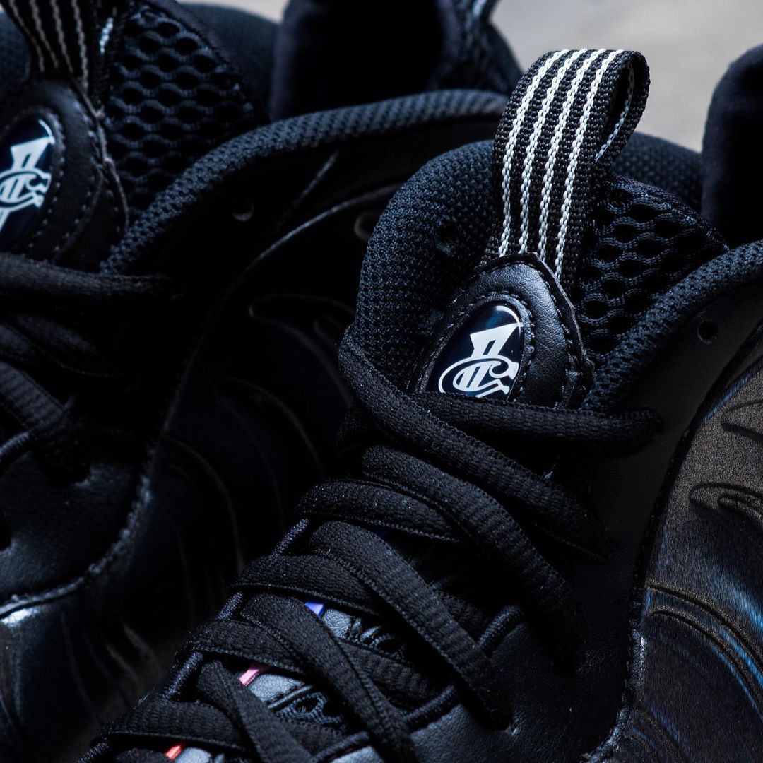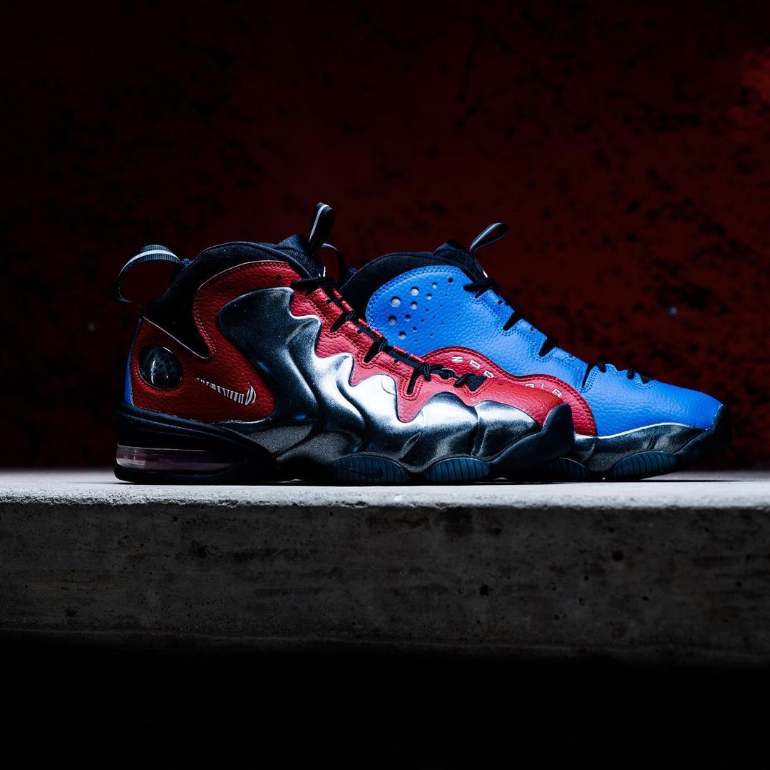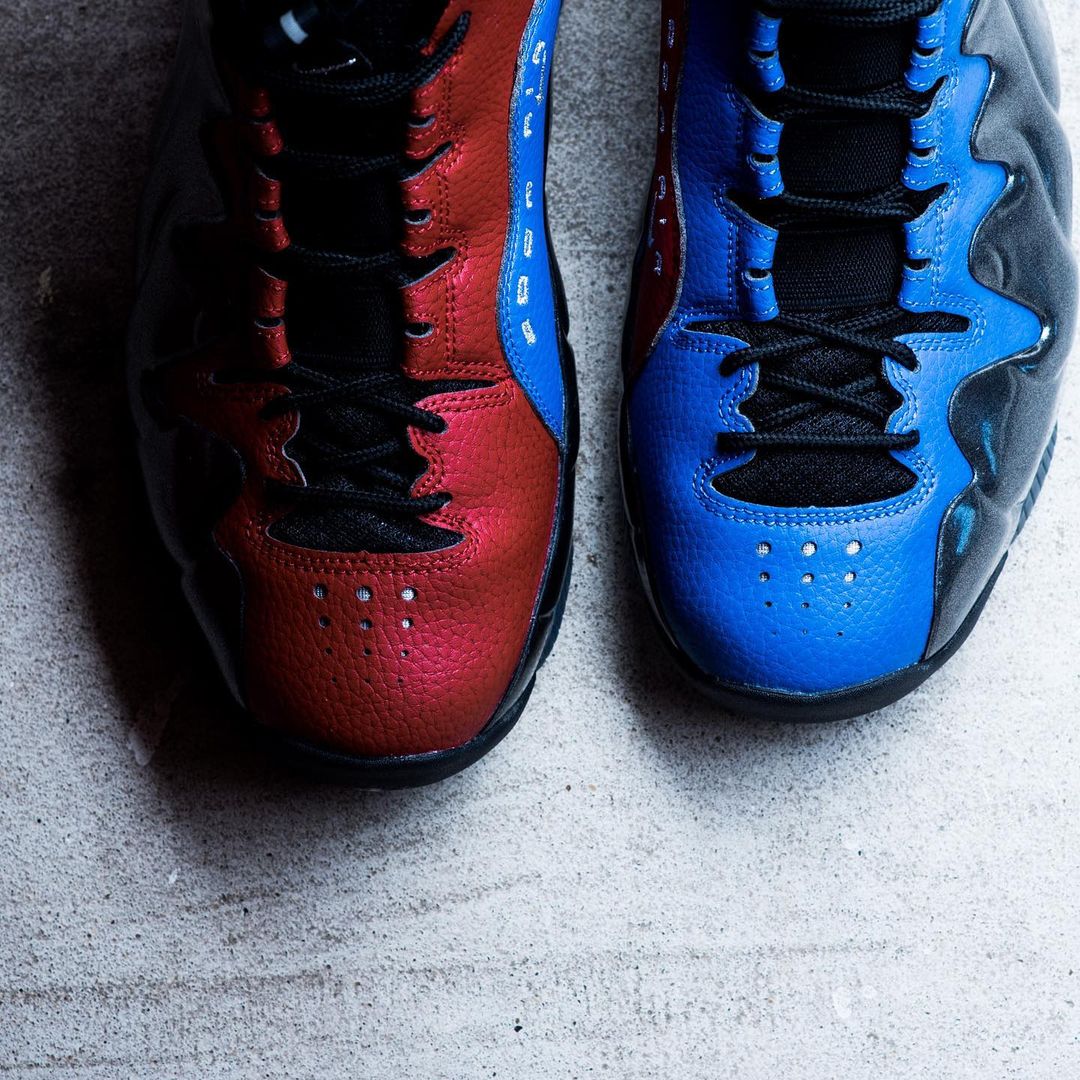 两双鞋的设计元素完全相同,都是在黑色基础上加入红、蓝两色点缀,两双鞋的发泡鞋面格外独特,这点在 Air Foamposite One 上尤为明显。