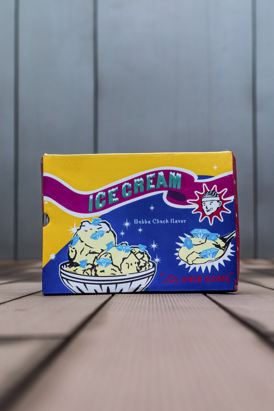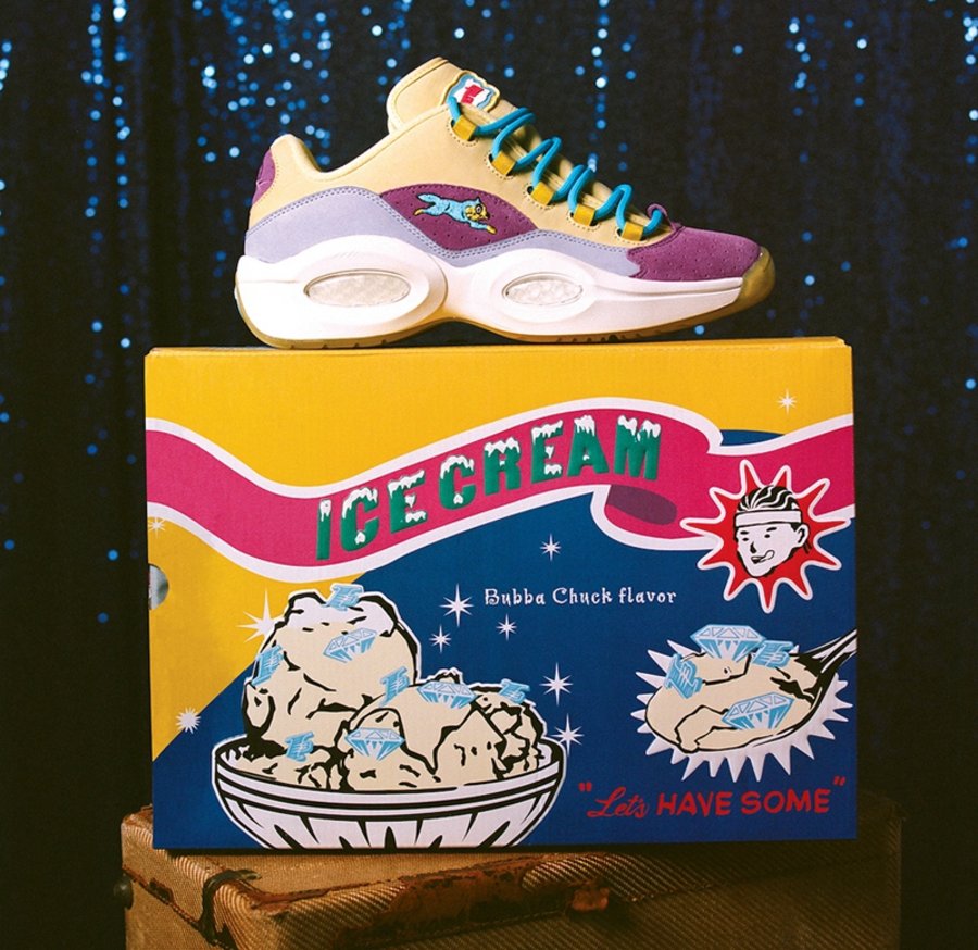 BBC Ice Cream x Reebok Question Low 鞋盒造型采用蓝、黄、粉三色装扮,并以冰激凌、钻石等元素揭示联名主题。