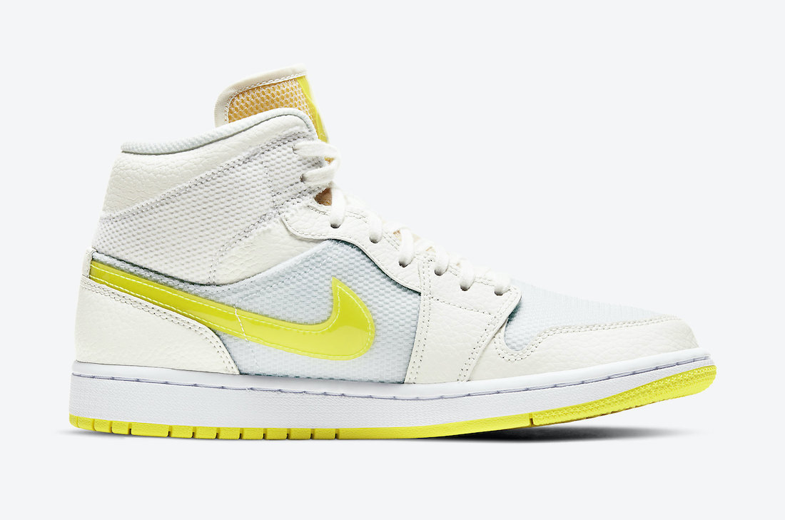「经济舱」Air Jordan 1 Mid “Voltage Yellow” 选以皮革搭配网面材质打造,侧身黄色 Swoosh Logo 非常醒目。
