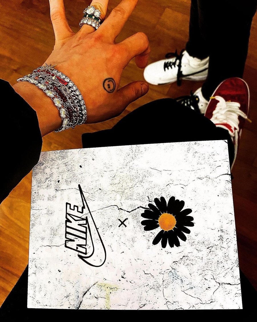 可以看出相较于市售版的白色鞋面,亲友限定版本在鞋面、中底 AIR 字样及涂鸦、鞋舌雏菊 Logo、鞋跟等位置均换上了鲜明的红色。