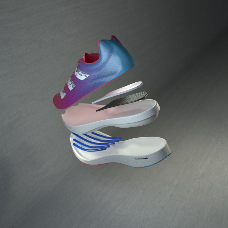 以全新发泡材质 LightstrikePRO 为主体,是目前 adidas 最轻最弹的缓震材质。