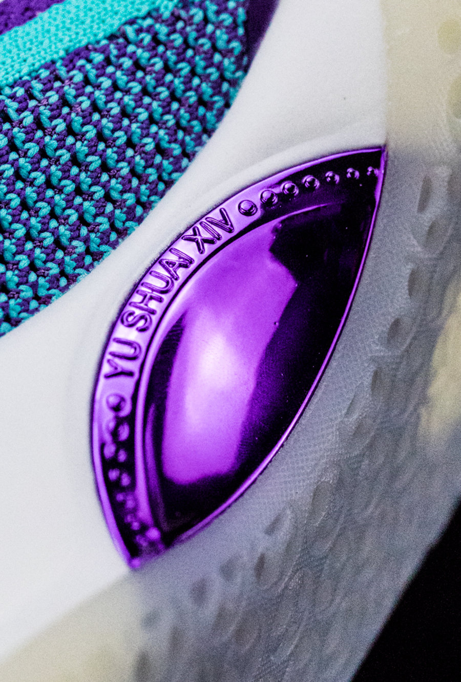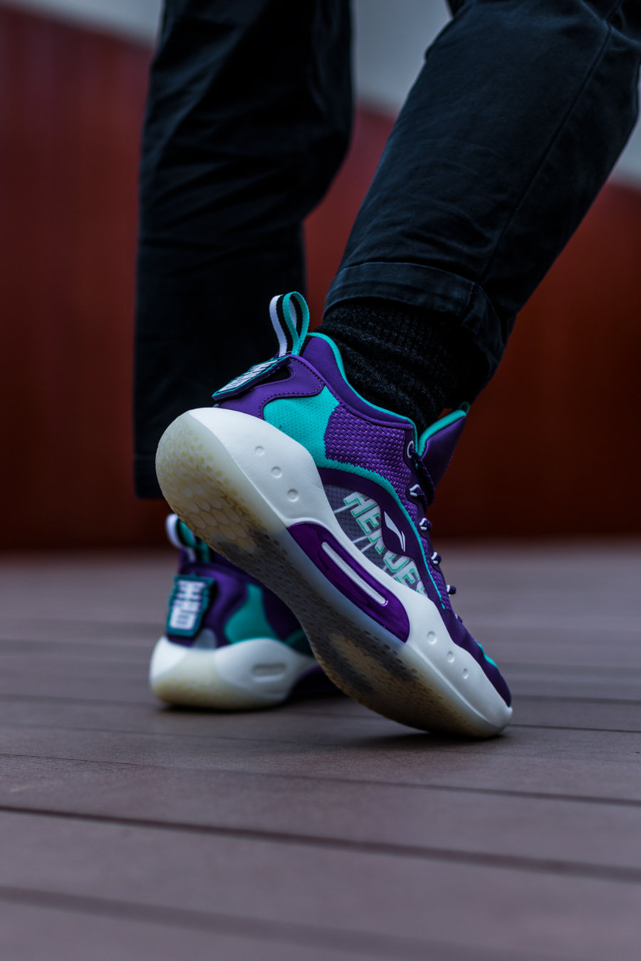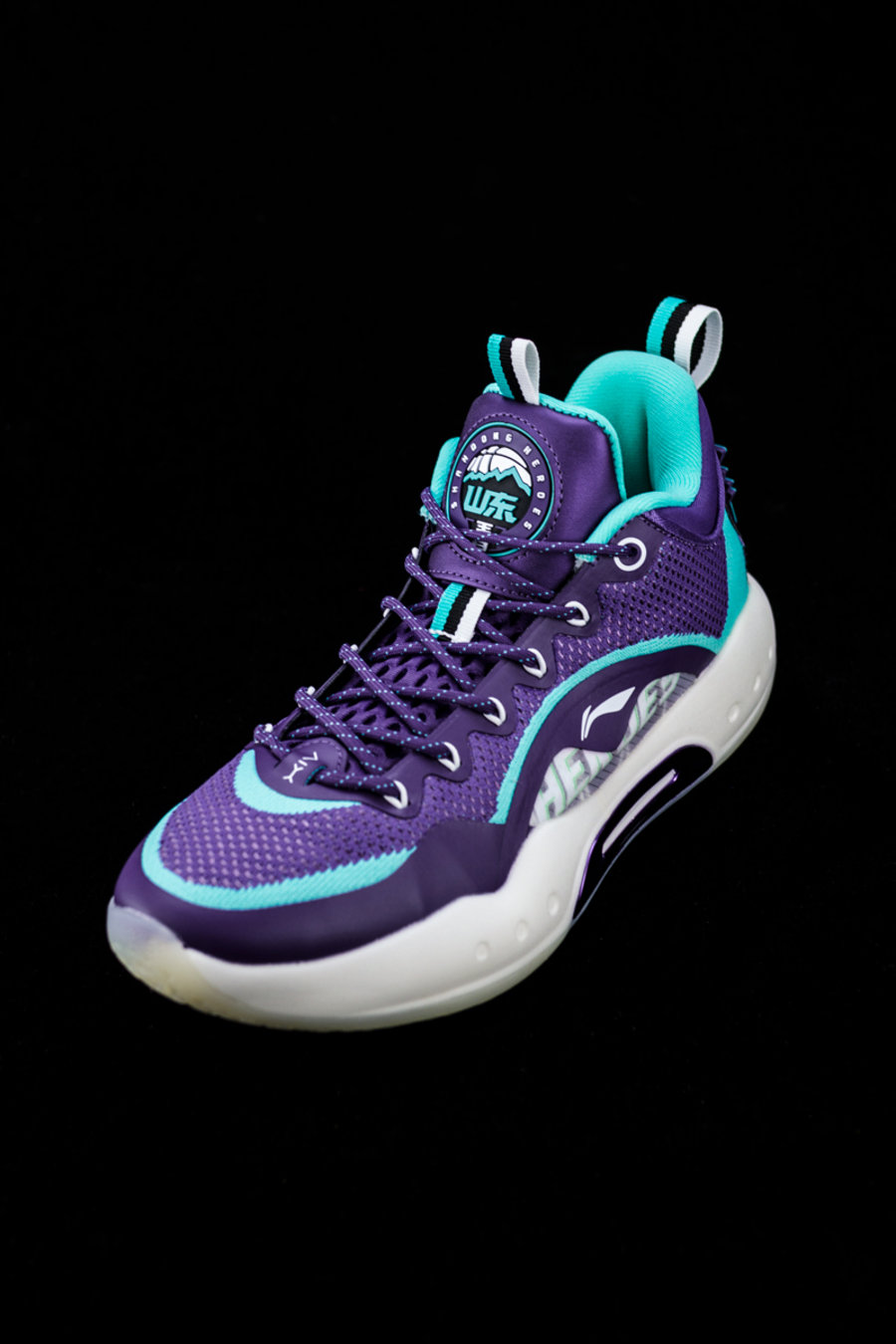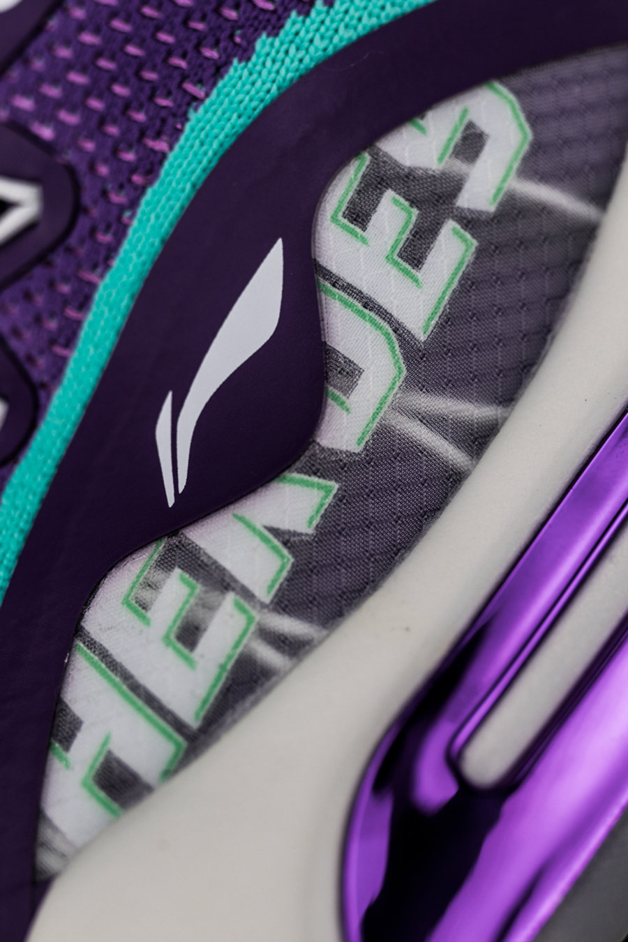 第一双是 CBA 山东王者队专属 PE,整体采用紫色为主调打造,湖水绿点缀细节。