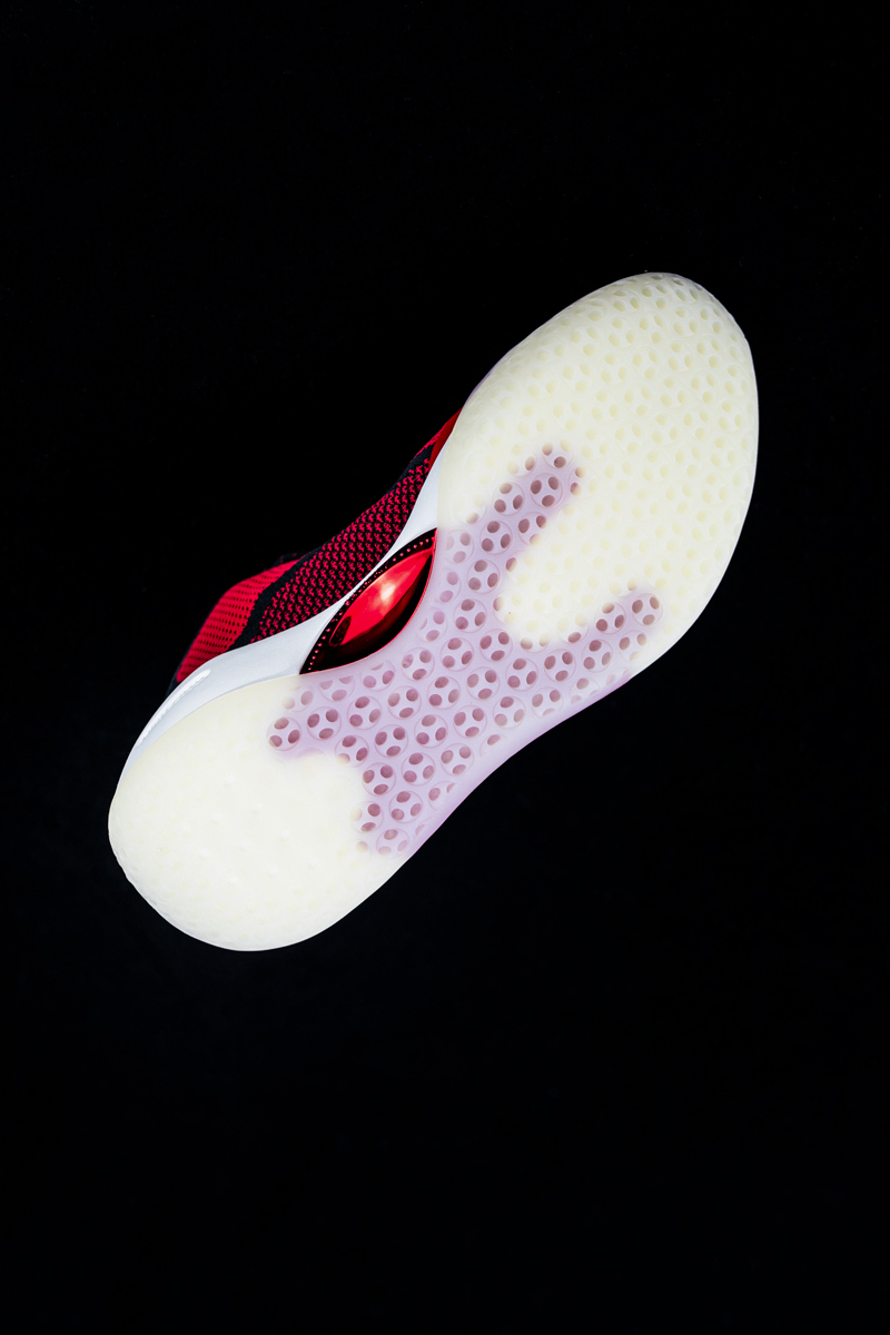 鞋身整体采用红色打造,细节处点缀黑色,将球衣配色完美呈现。