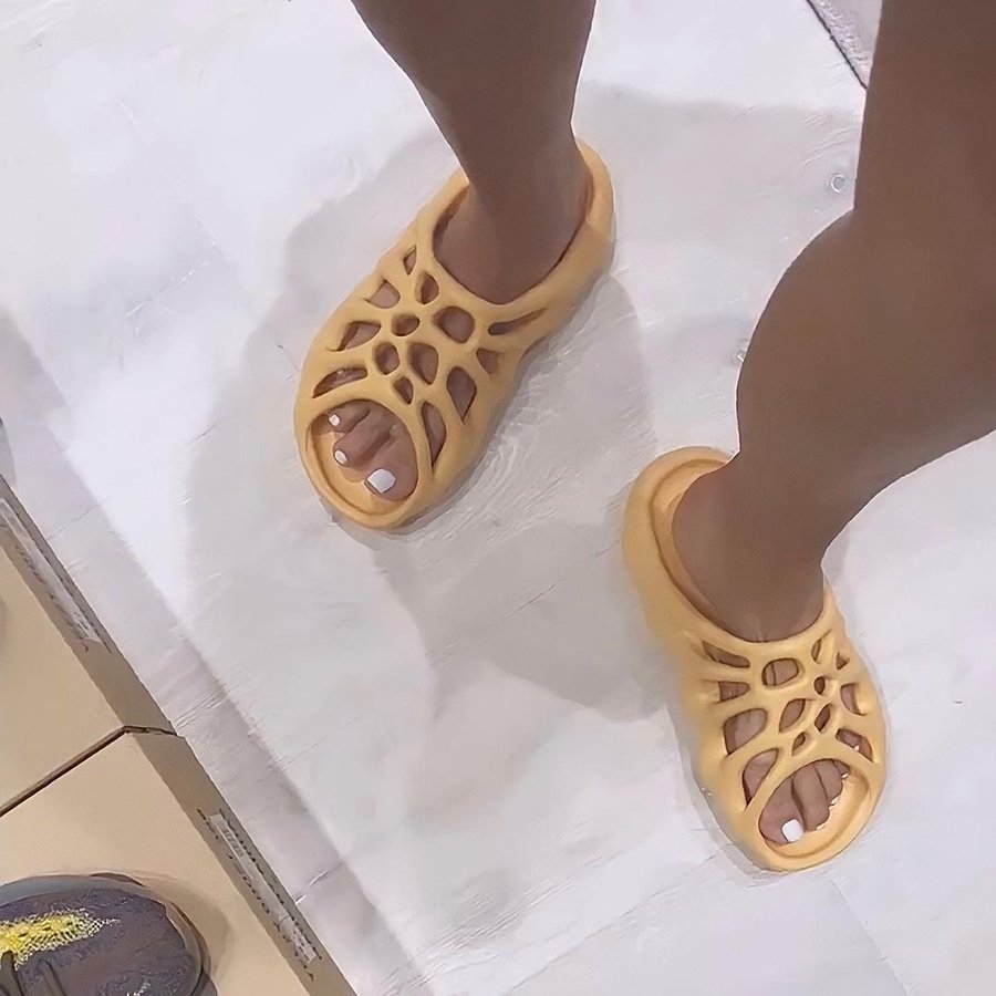 她穿的是一双黄色的 Yeezy 450 Slide 拖鞋。