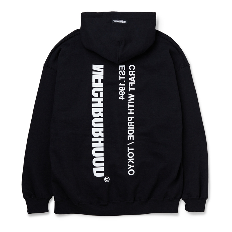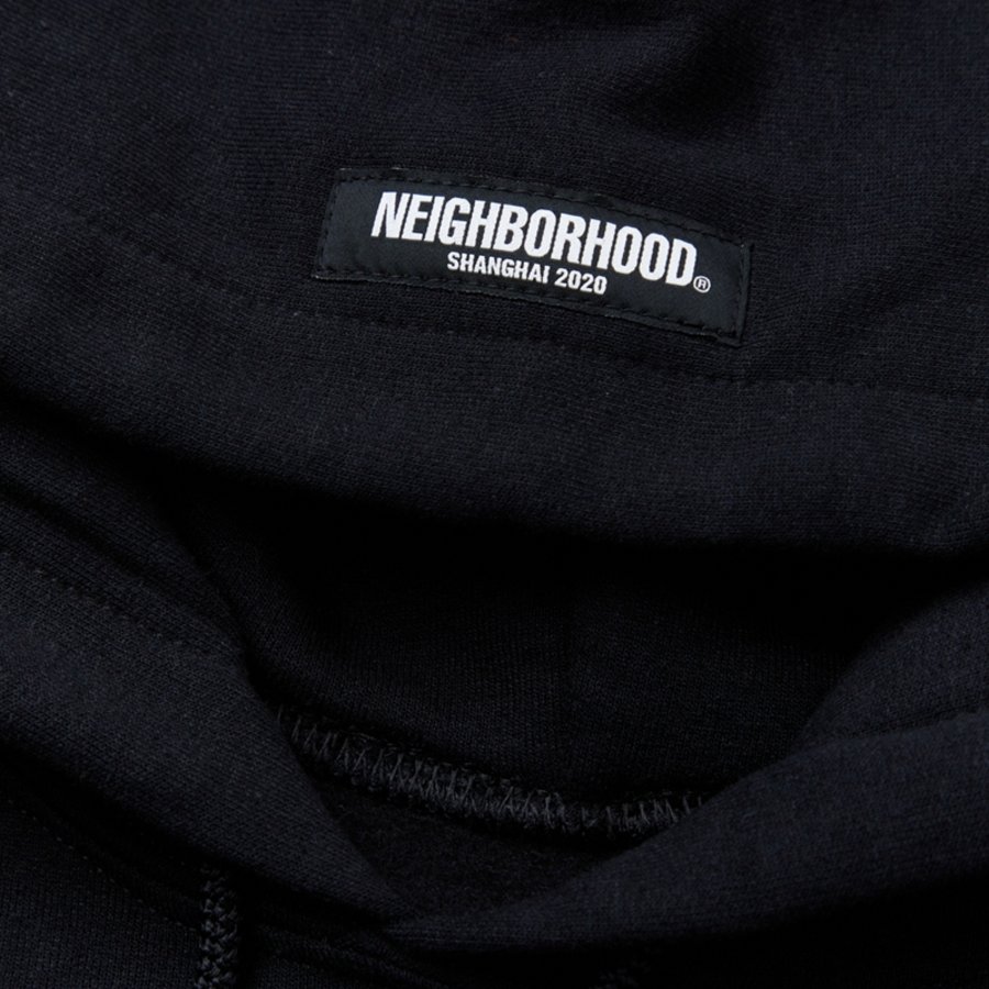 连帽卫衣正面妆点了 NEIGHBORHOOD Logo 胶印字样,背面以竖向排列的超大图案点缀。