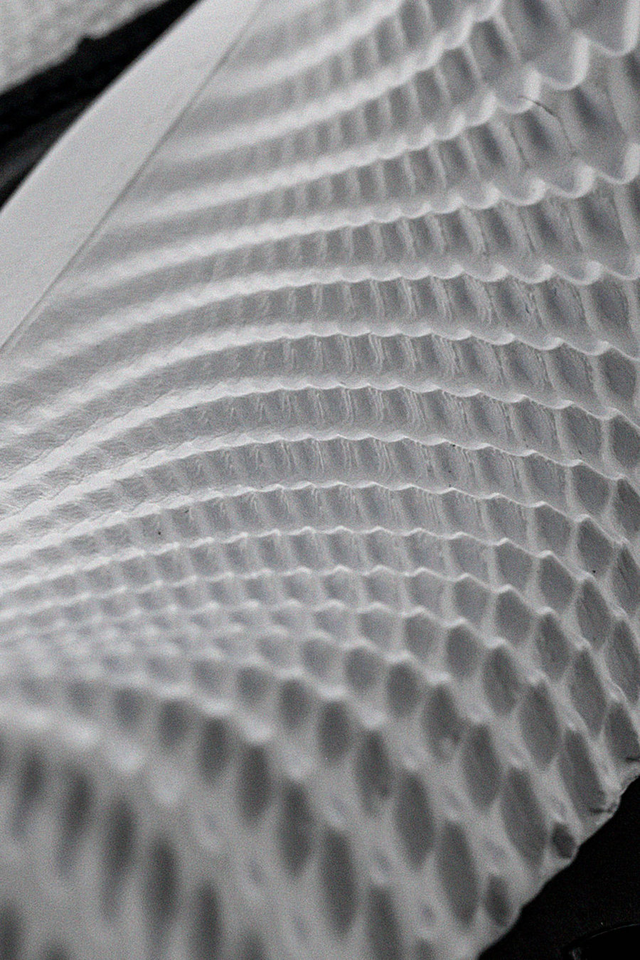 裸露接触地面的部分,在不同区域以多种不规则形式呈现纹路,造型极具未来感。