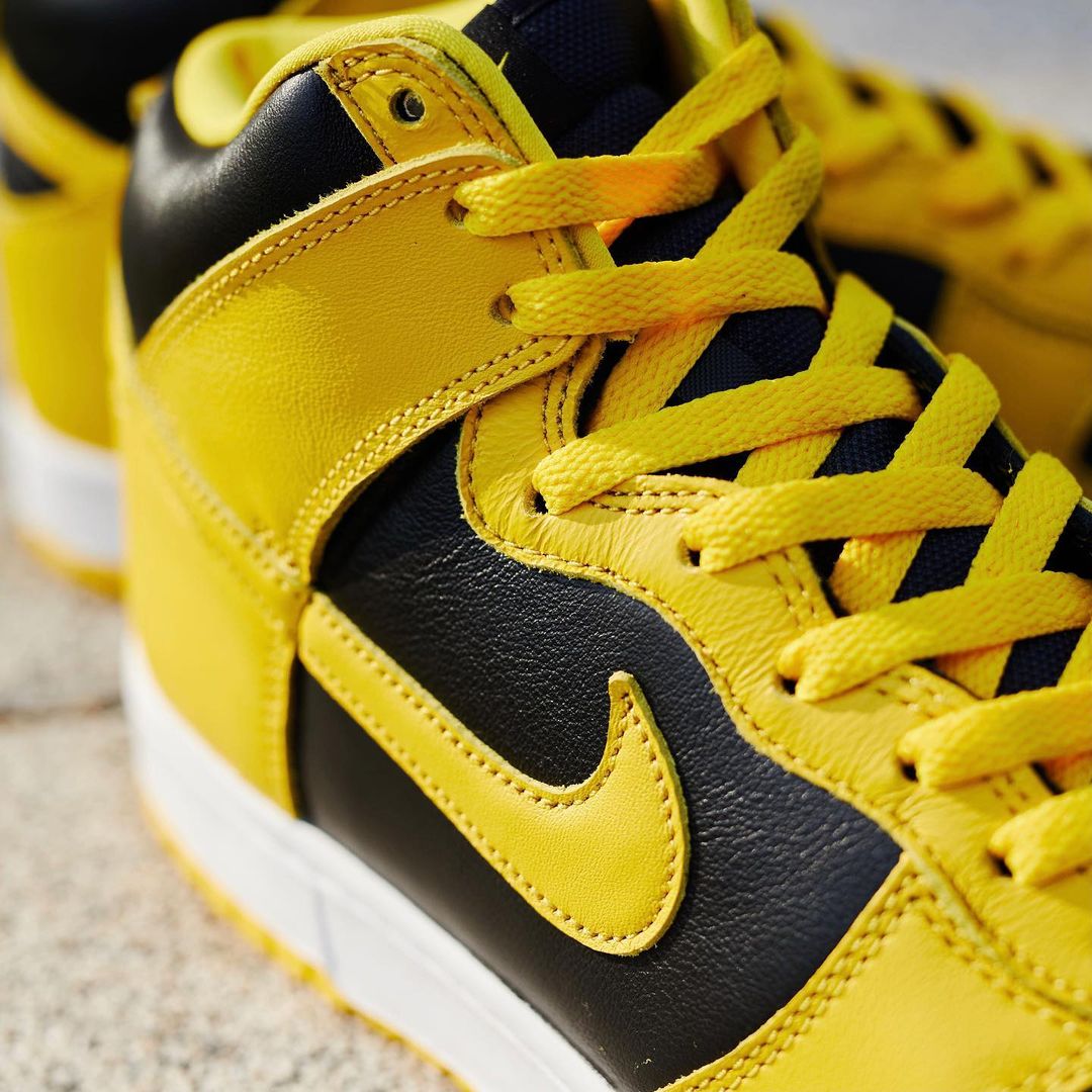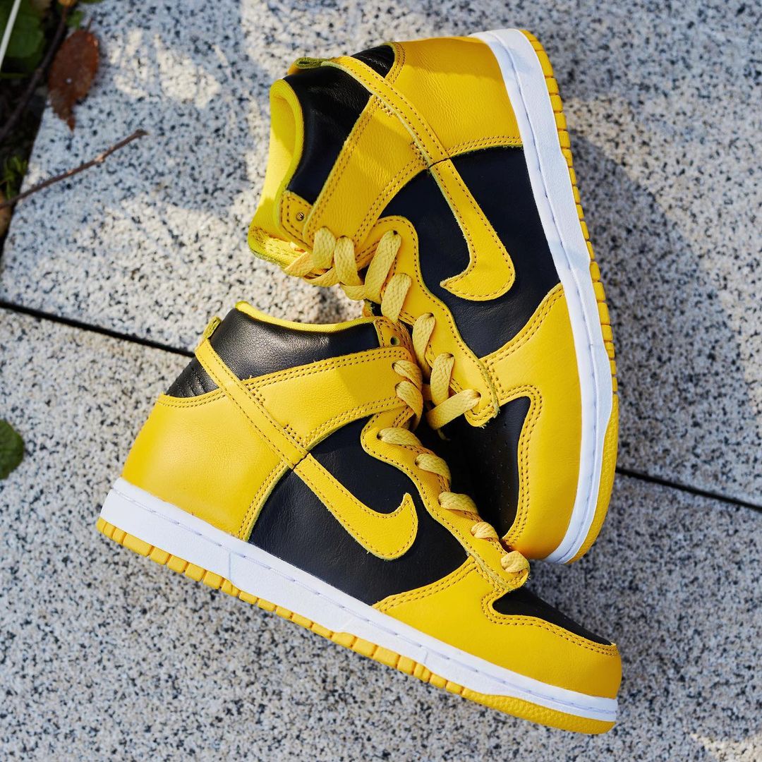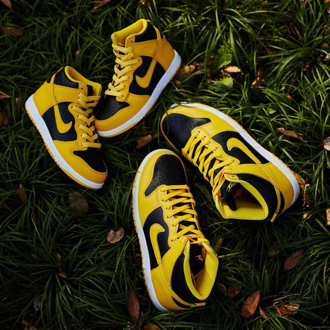 本周就有一款超帅的黑黄配色,外观上和天价神鞋 Dunk Hi “Wu-Tang” 实在太像了,除了没有后跟刺绣 Logo 其他几乎都一样。
