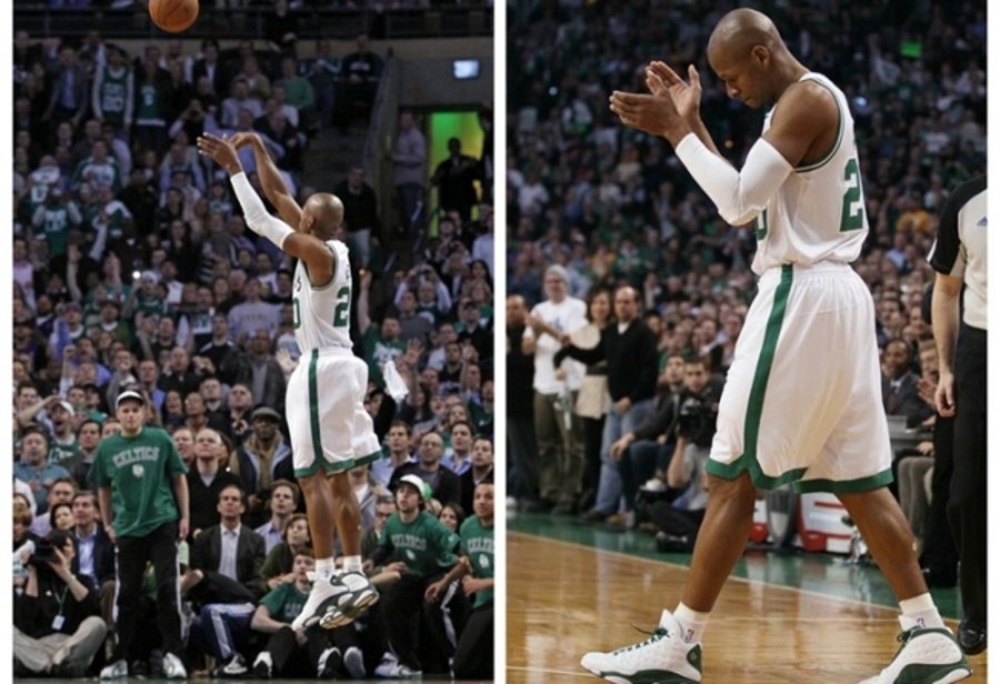 除配色采用当时主队凯尔特人的白绿呈现外,鞋舌跳投姿态的 Ray Logo 更是经典中经典。