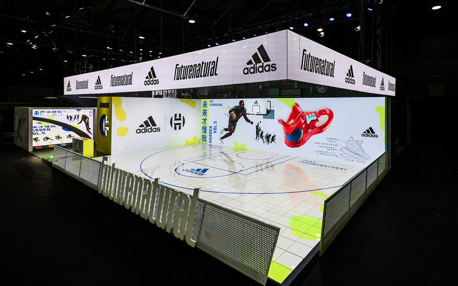 adidas 是今年面积最大的展台之一,主打鞋款是最新顶级战靴 Harden Vol.5。