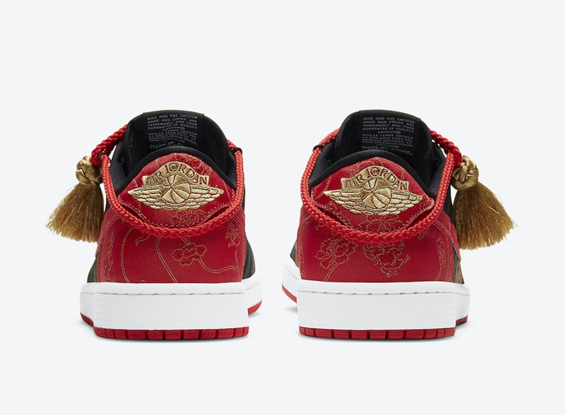 整双鞋以 Air Jordan 1 Low 为蓝本进行打造,丝绸材质的鞋身搭配经典的黑红配色,用料十分考究,更是把质感拉满。