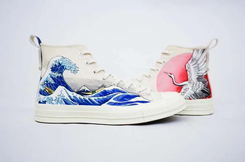 在纯白鞋身之上,富士山于松柏辅以细腻逼真的手绘呈现。