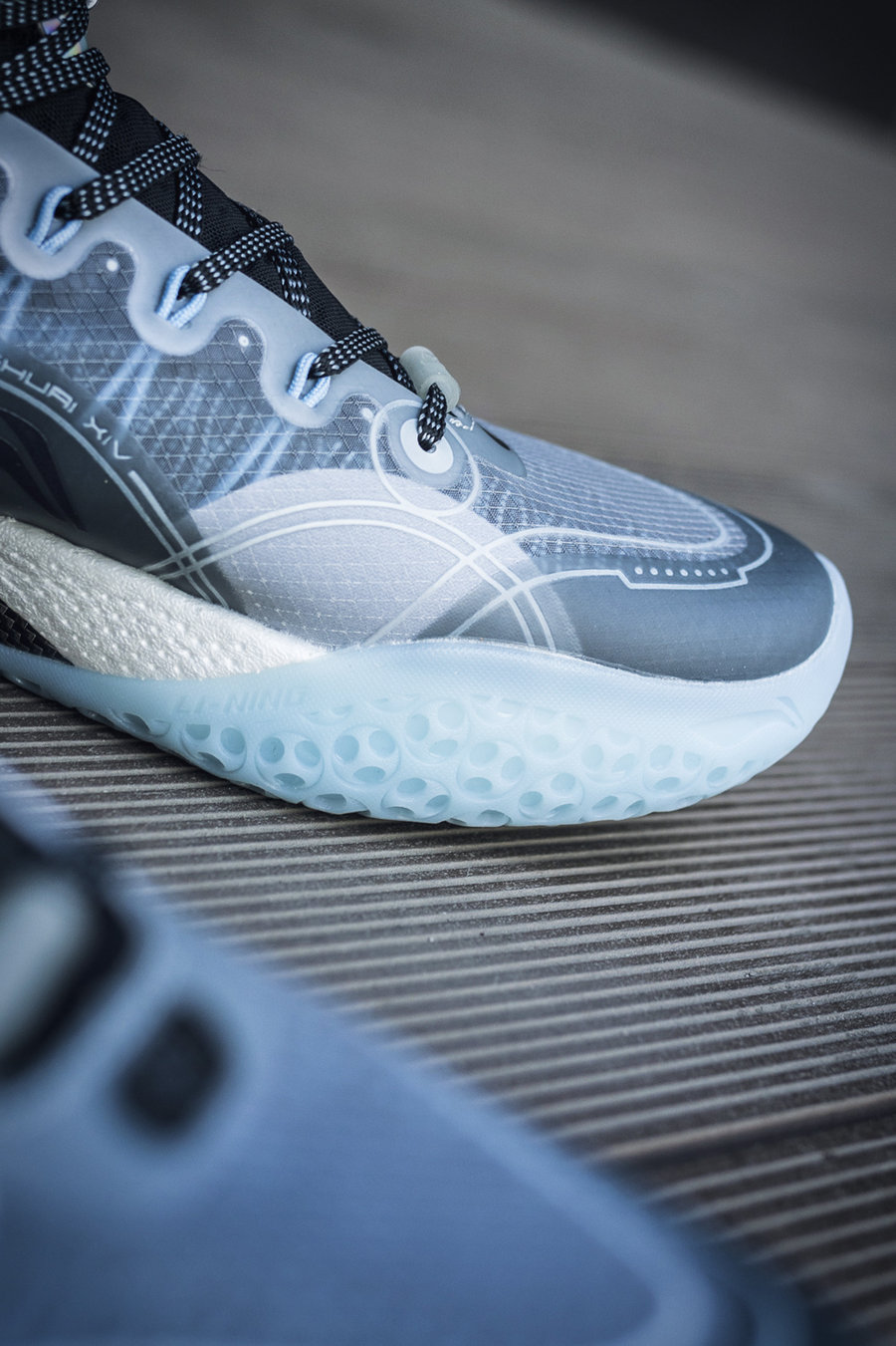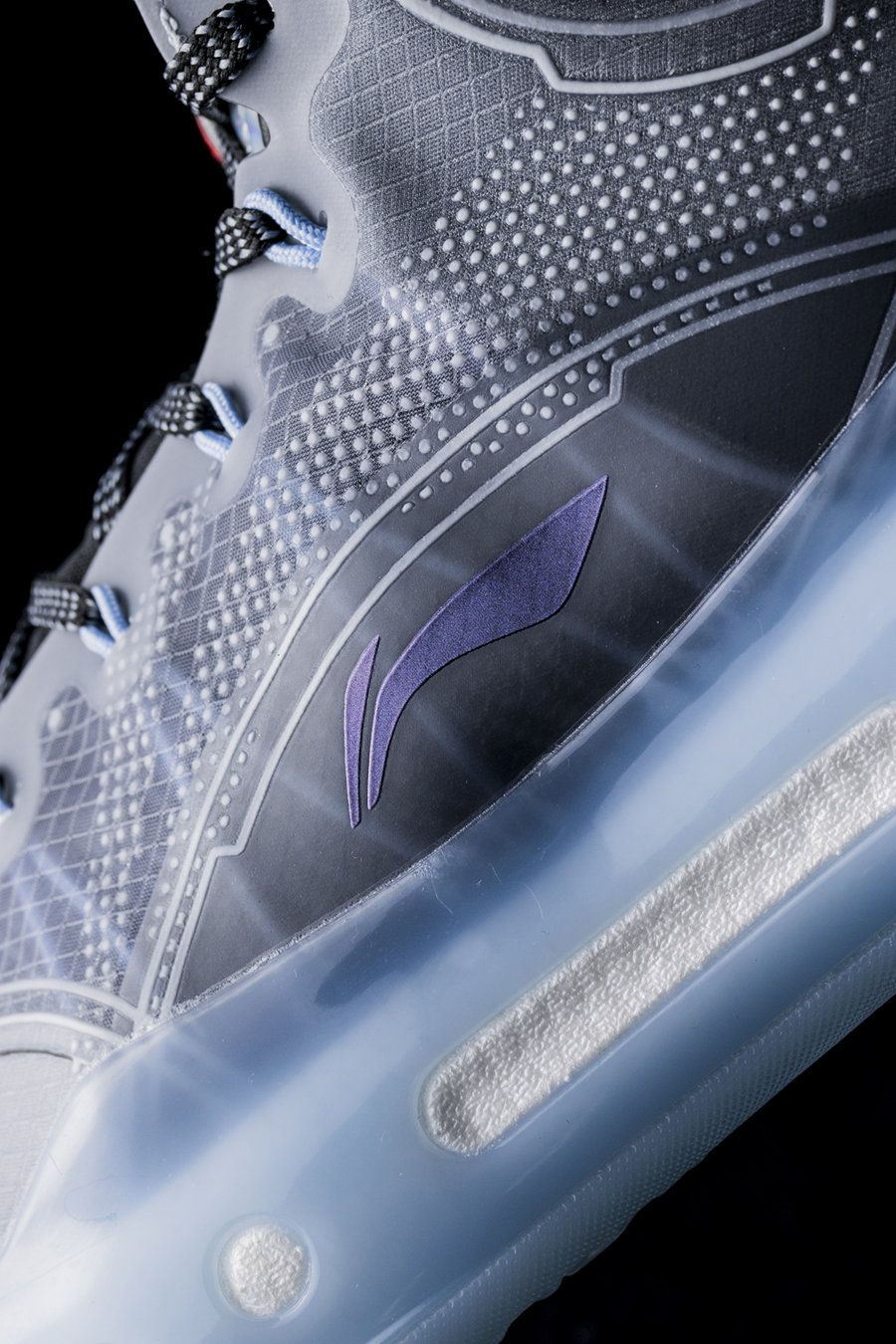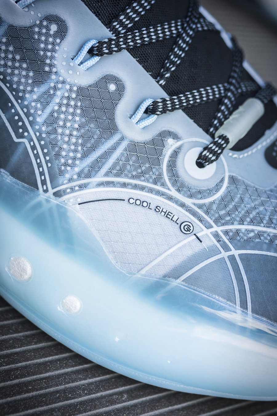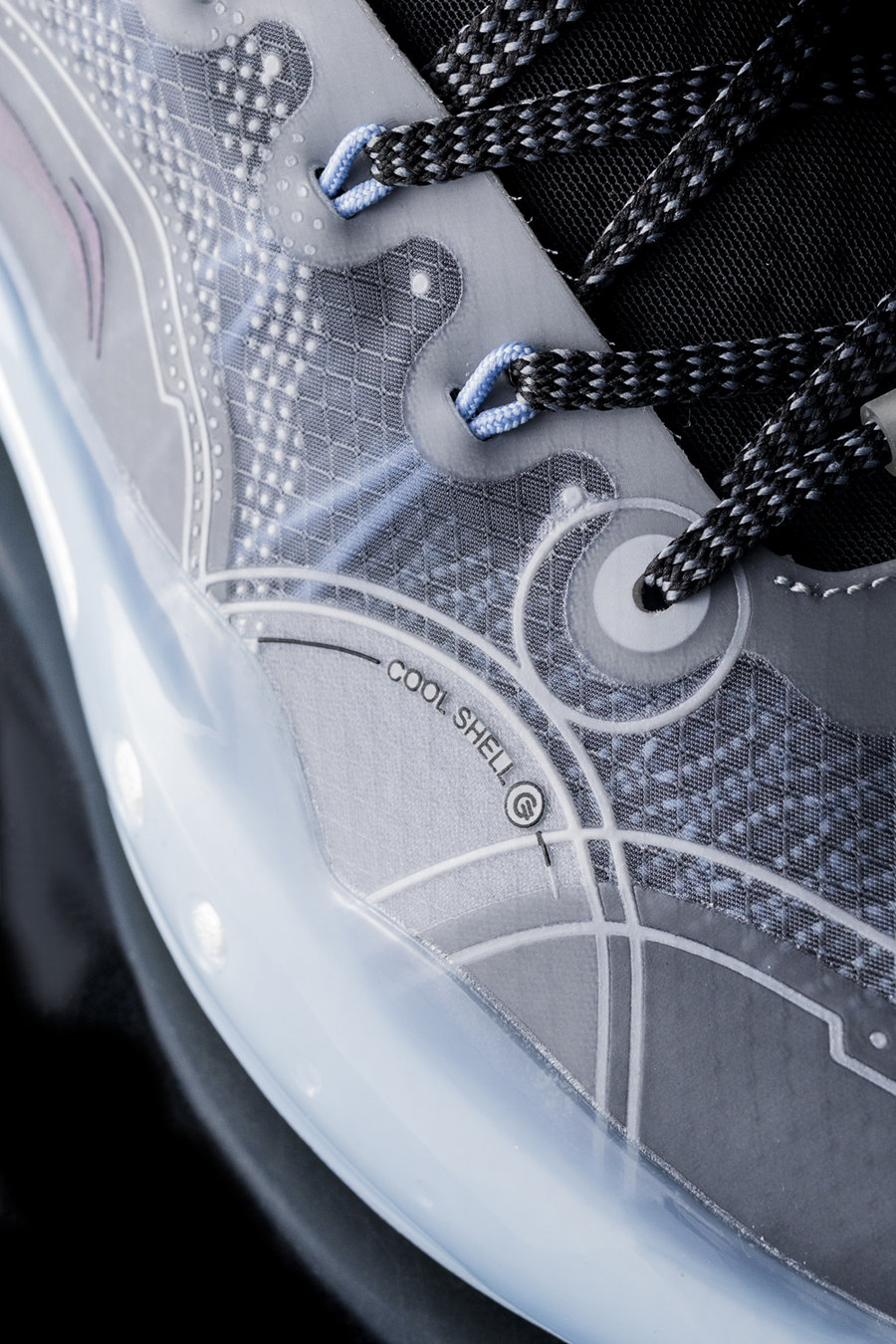 设计师孙明旭为了使鞋面比上一代更加细腻,大胆在篮球鞋上采用半透明纱线材质 Cool Shell。