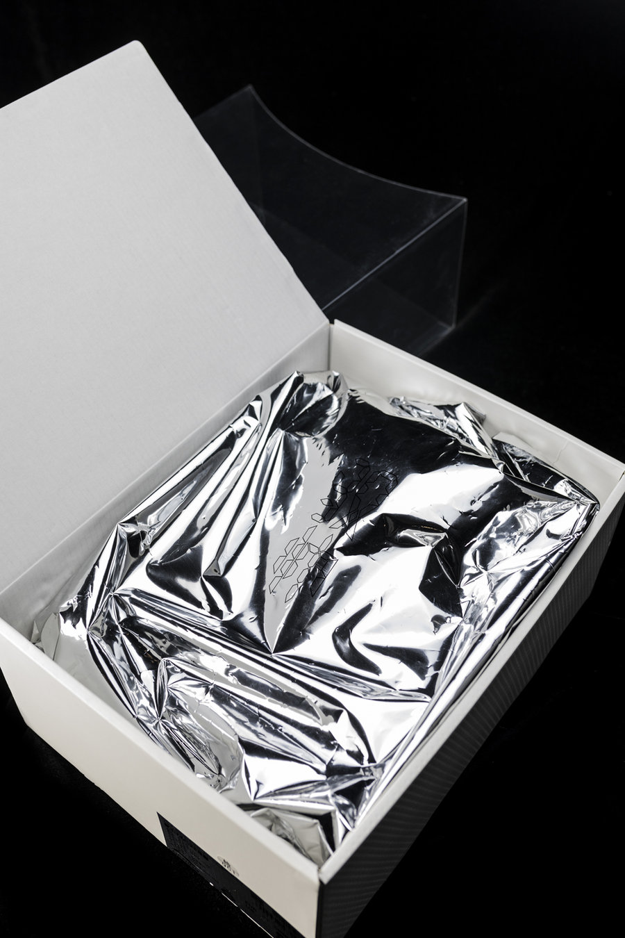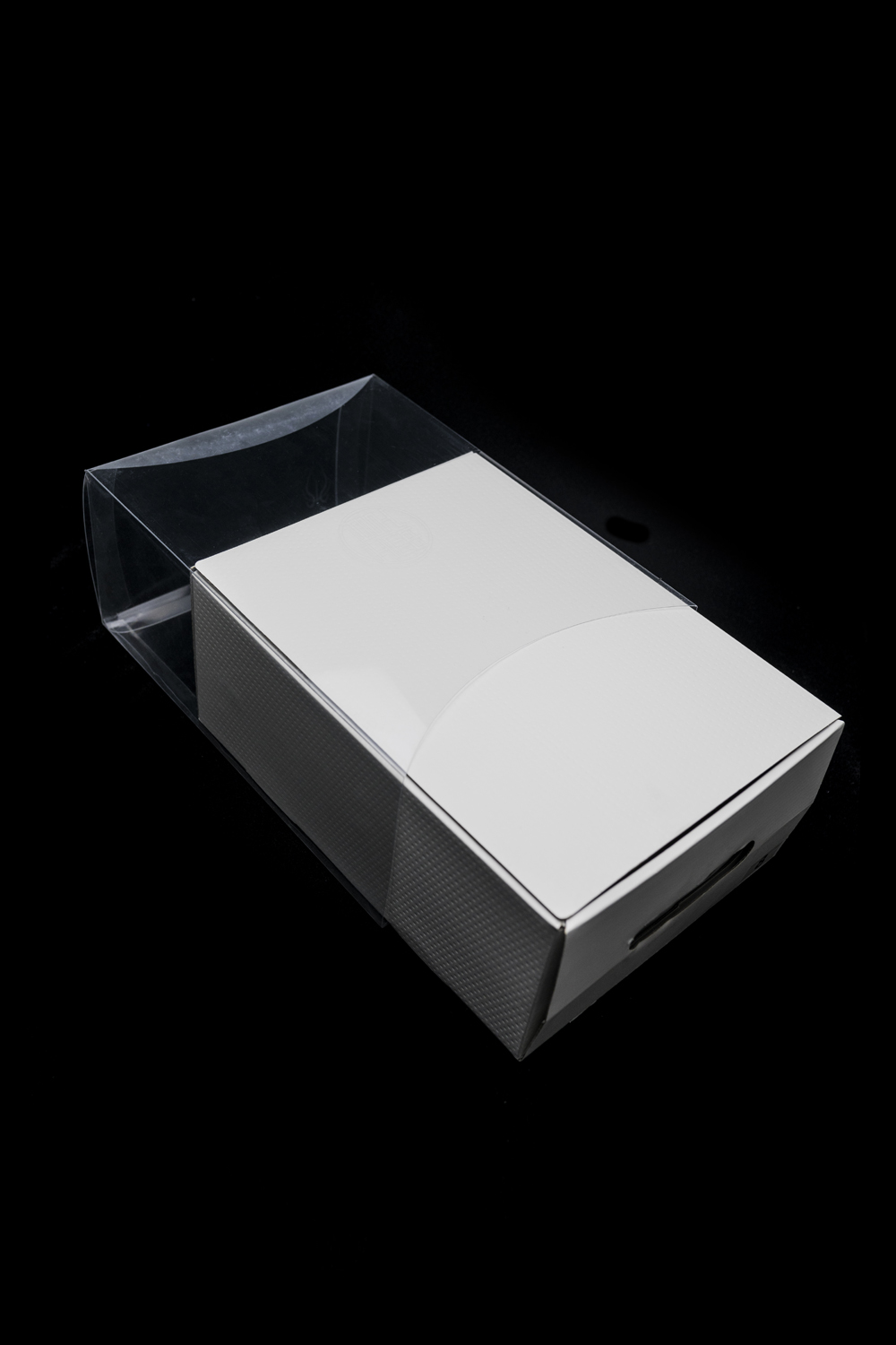 鞋盒规格升级,透明抽屉 + 银色反光鞋袋,高级又极具科技感。