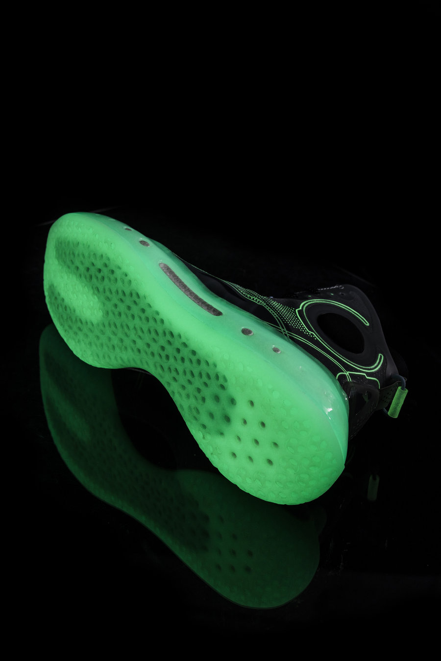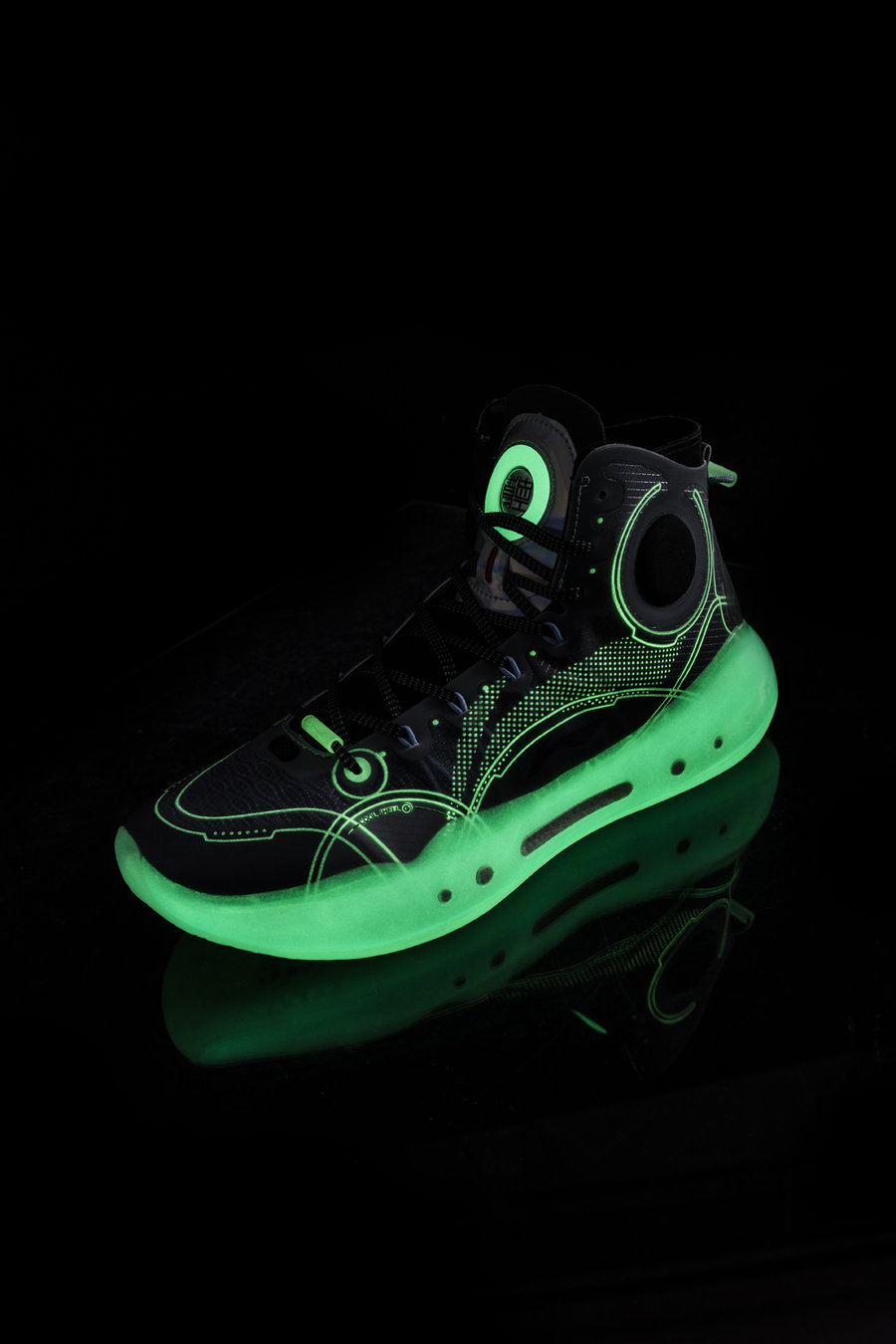 关上灯小编就傻眼了!整个鞋底和鞋面线条都是夜光的,同时鞋面浮现出点阵组成的超大李宁 Logo。