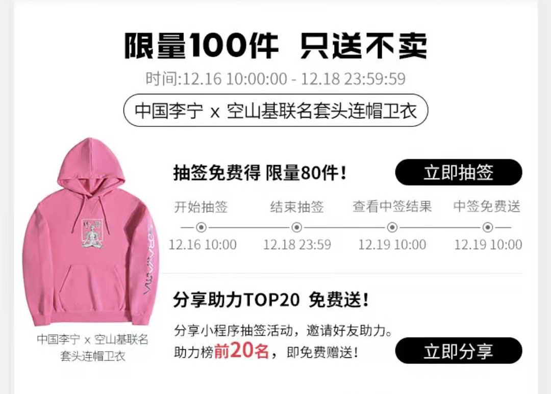 目前李宁官方旗舰店小程序已经开启抽签,将免费送出 100 件联名卫衣。