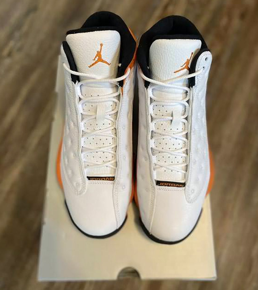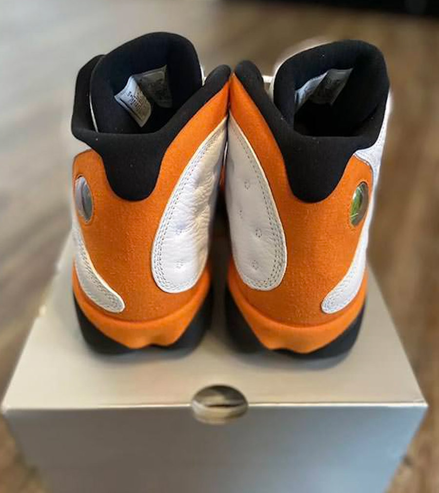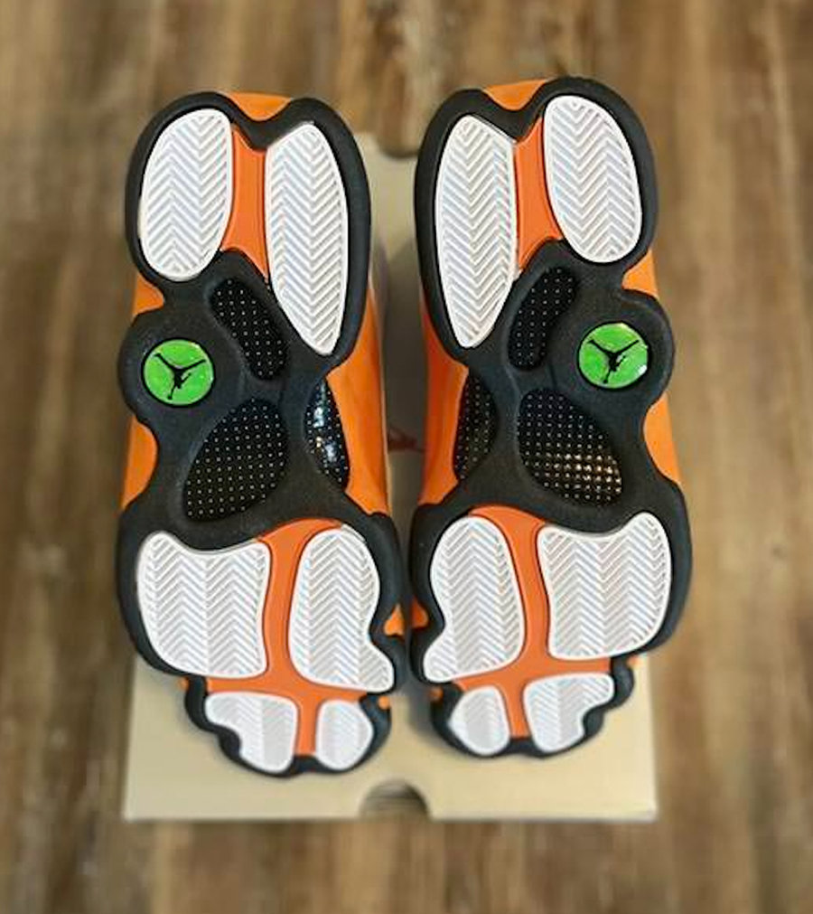 橙色麂皮覆盖鞋身下方以及中底,展现出 Air Jordan 13 独有的规格,同时带来「扣碎」配色既视感。