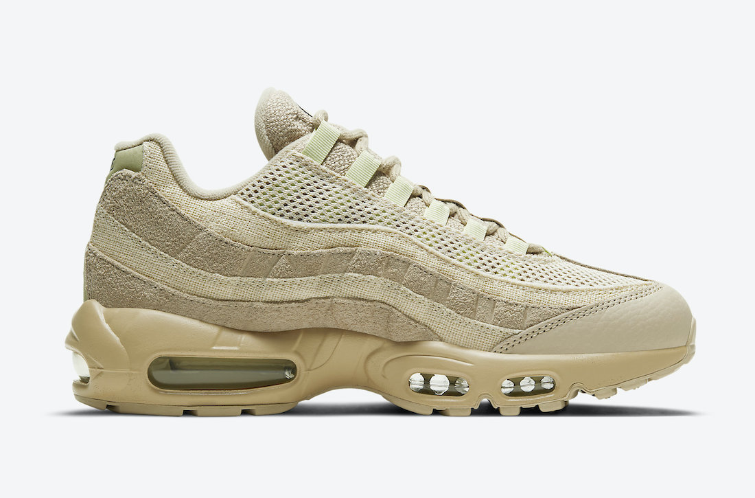 整双鞋以浅卡其色为主调,Air Max 95 标志性的多层鞋面分别使用网眼、织物和翻毛皮革拼接组成。