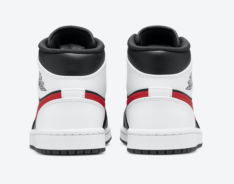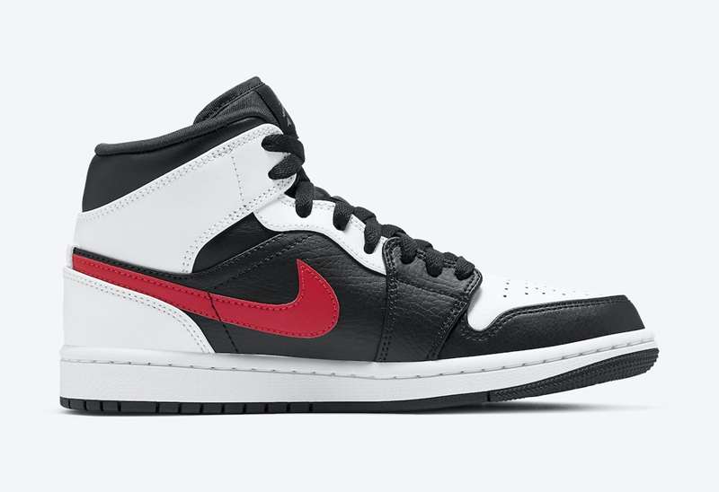 整体延续 Air Jordan 1 Mid 经典的 8 孔鞋身,以黑色为主调,搭配白色框架,造型十分简约。