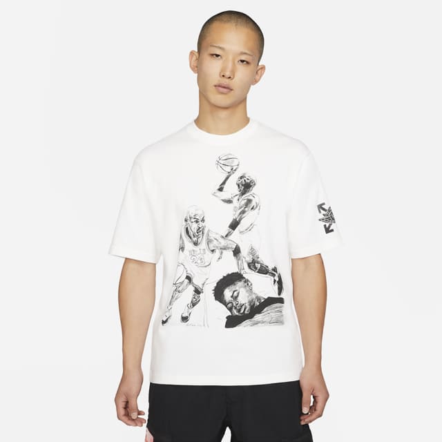 T 恤则是此次联名系列服饰中较为亲民的一款,定价 ¥799 元,用插画印花的形式讲述了一个孩子的「乔丹梦」。