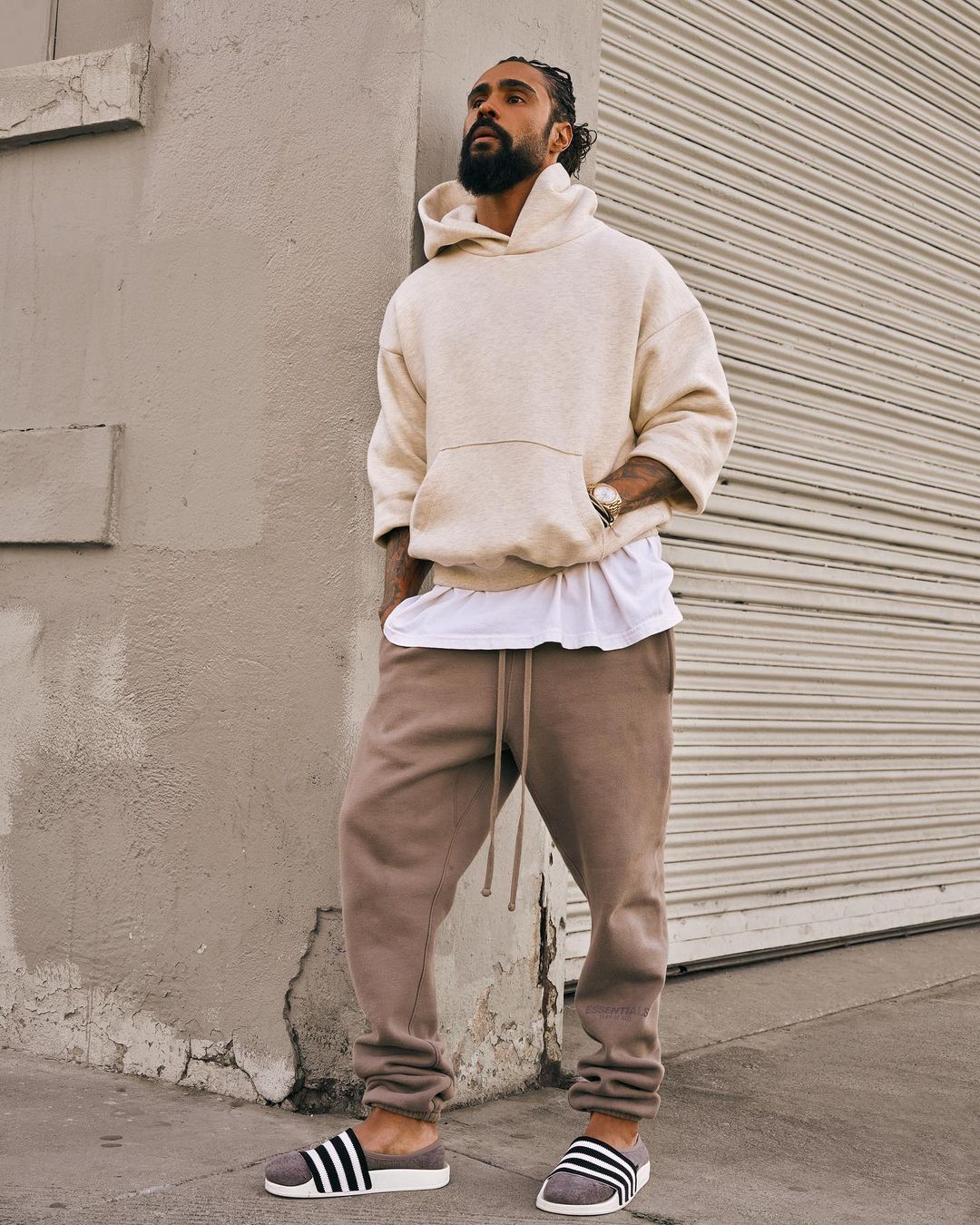 随后又晒出上脚 adidas 拖鞋的整身穿搭,Fear of God 的高街风格倒是一如既往,看起来 Fear of God 和谁联名都毫无违和感。