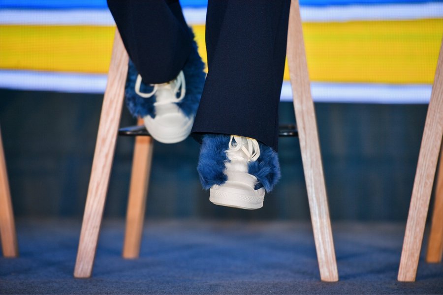 中国著名网球职业运动员李娜亲临现场,白色T 恤打底,外穿绿色西装外套,上脚刚刚发售的 AMBUSH x Converse Chuck Taylor All Star 1970S 白蓝配色。