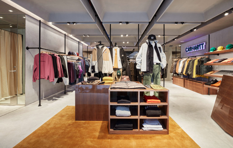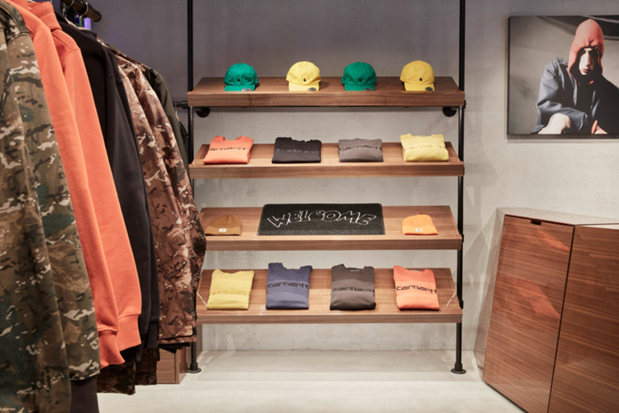 本次上海旗舰店承袭 Carhartt WIP 专门店传统的胡桃实木货架,并注入现代简洁的工业风格。