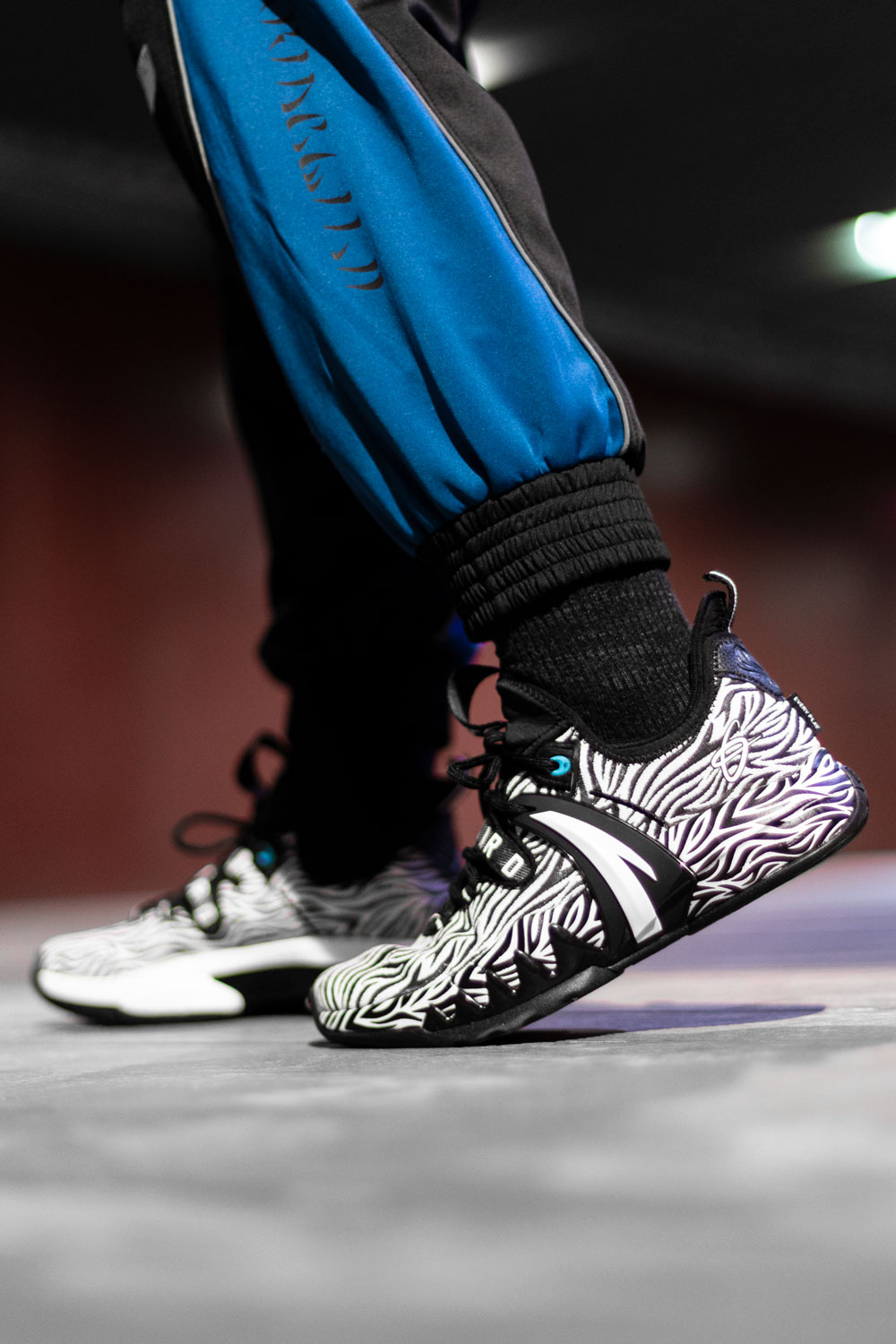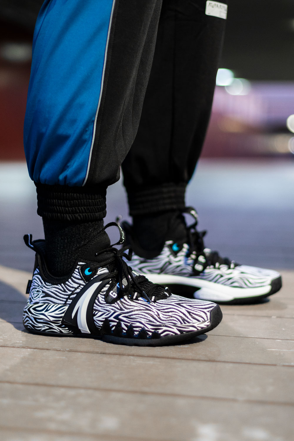 深色长裤凸显花哨鞋面,球场上最亮的崽绝对没跑。